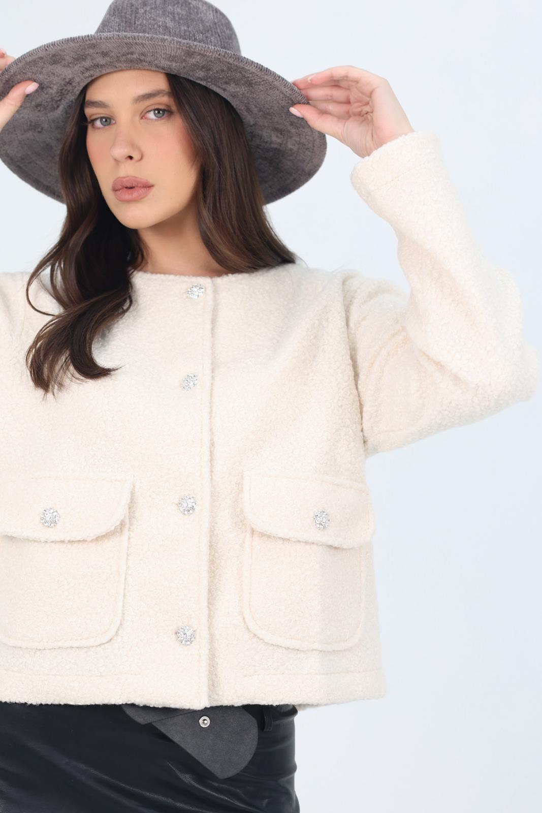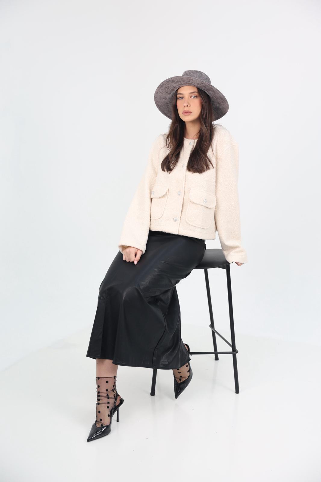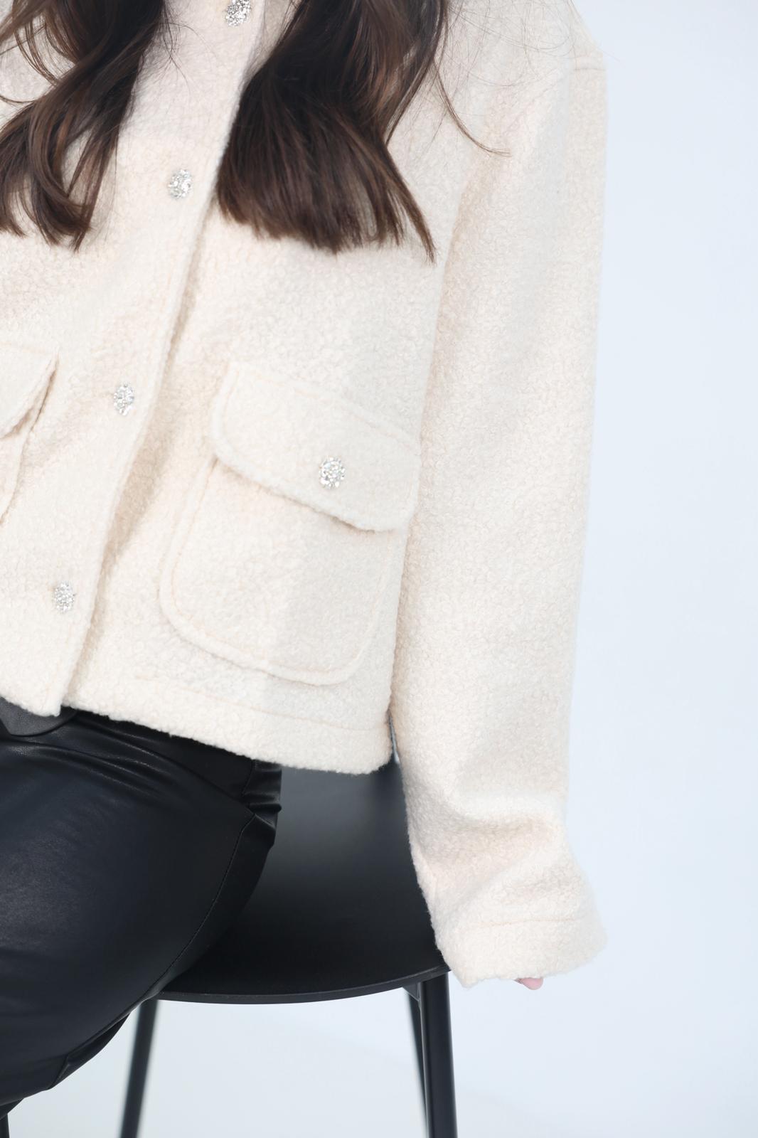 ג׳קט טוויד רך במראה מחויט ונקי, עם כפתורי קריסטל מעוצבים שמעניקים לו טאצ’ יוקרתי וזוהר.