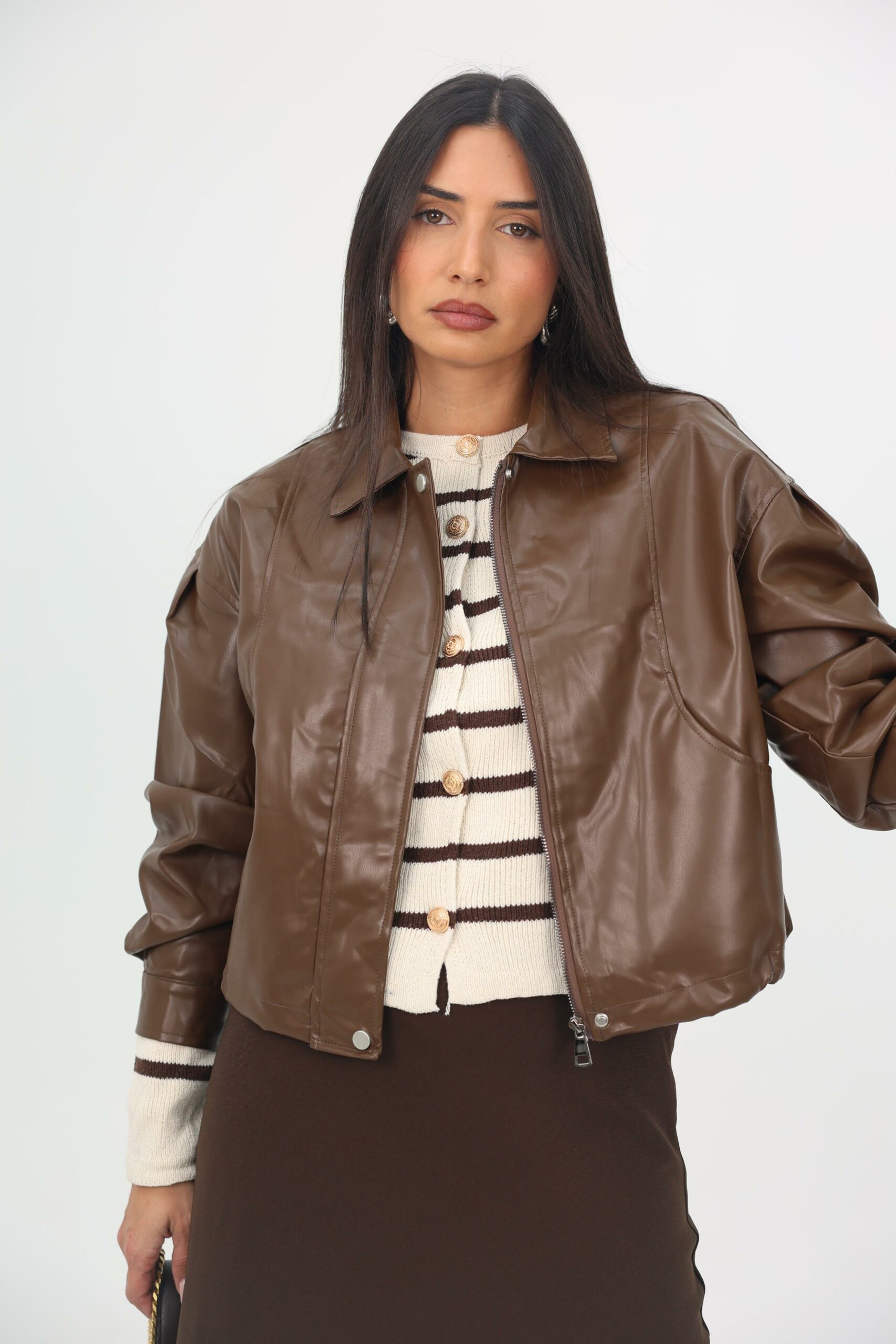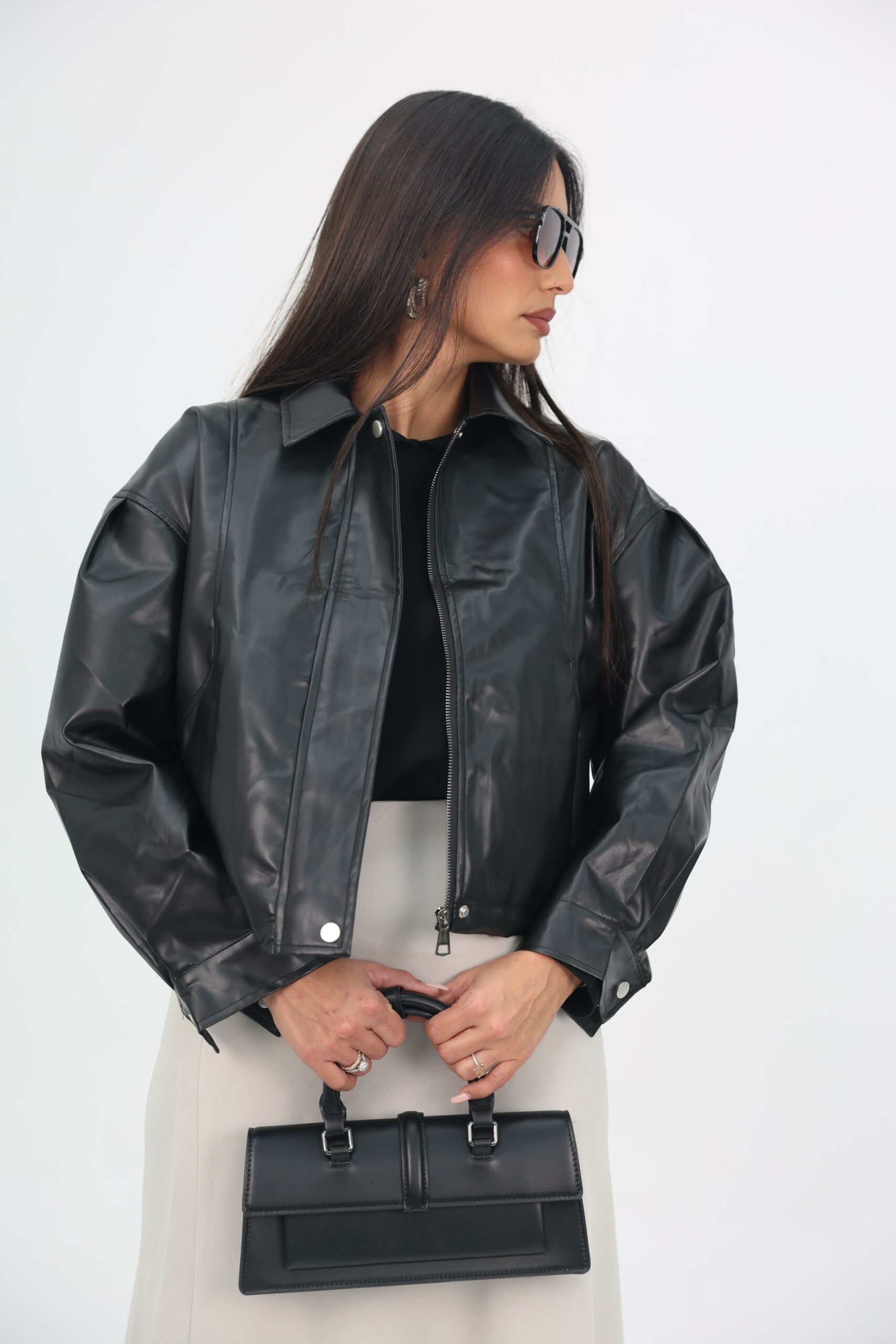 ג׳קט דמוי־עור בגזרה קלאסית ומדויקת, במראה נקי ומעודכן.