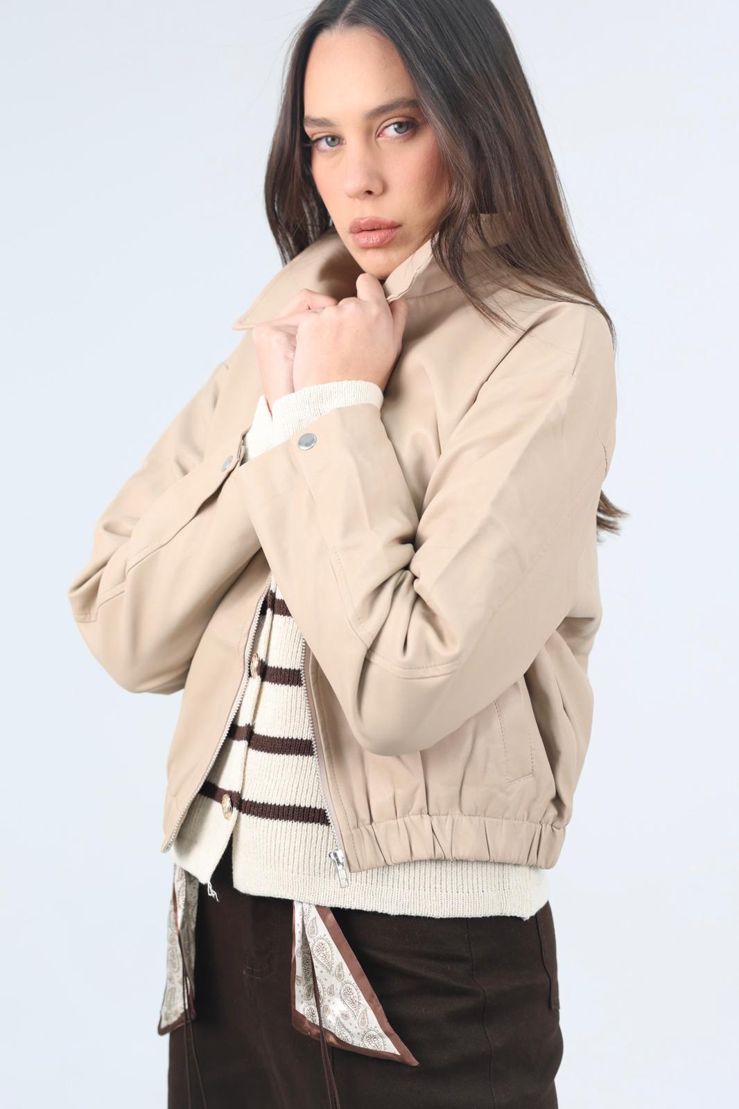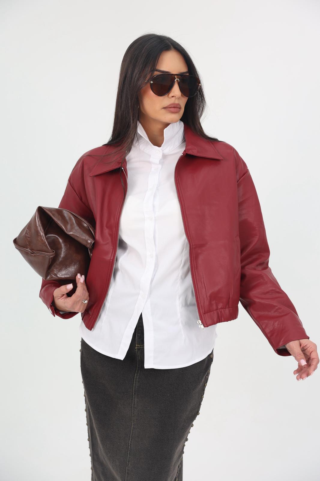 ג׳קט דמוי־עור בגזרת בומבר מעודכנת, עם רוכסן קדמי וגימורים נקיים למראה אורבני ושיקי.
