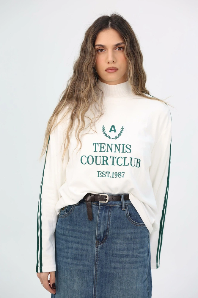 עשויה בד נעים למגע, עם הדפס קדמי בסגנון קולג’ קלאסי ופסי צד עדינים לאורך השרוולים להשלמת הלוק.
