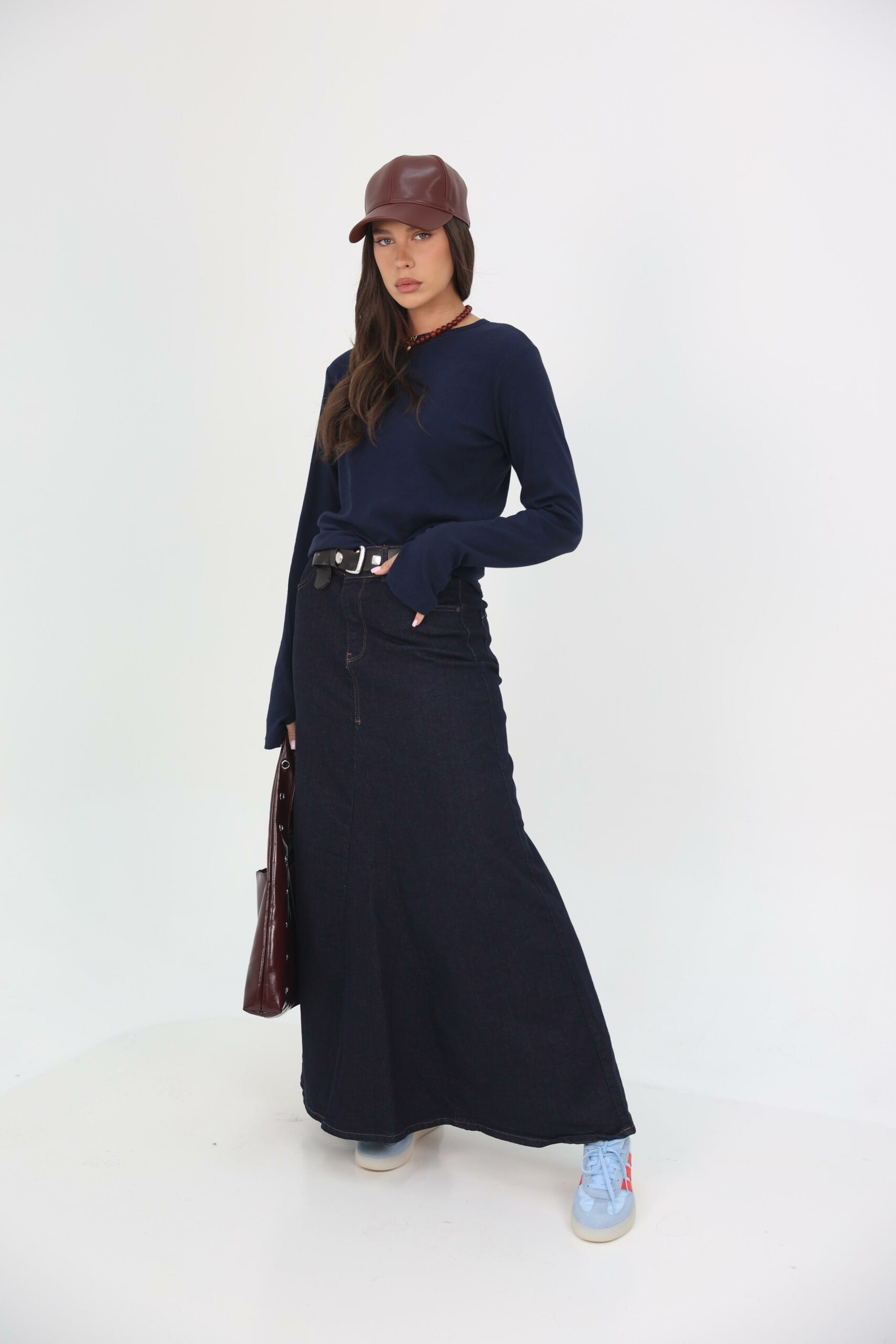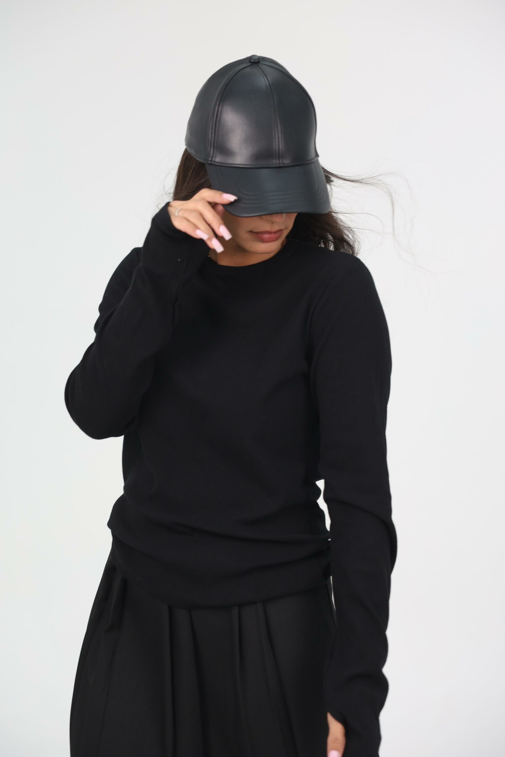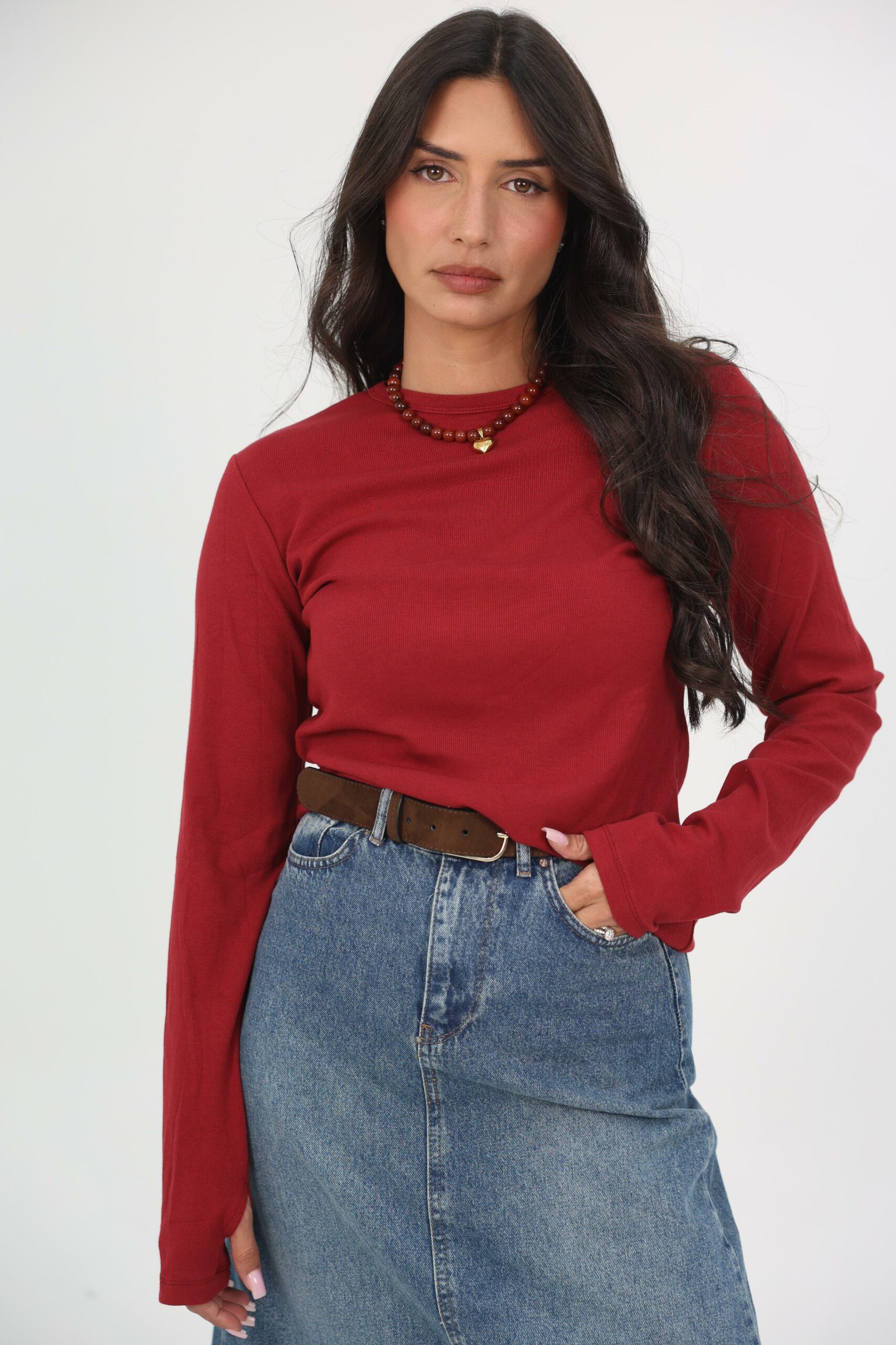 חולצת בייסיק בד ריב צווארון עגול שרוול כפפה.