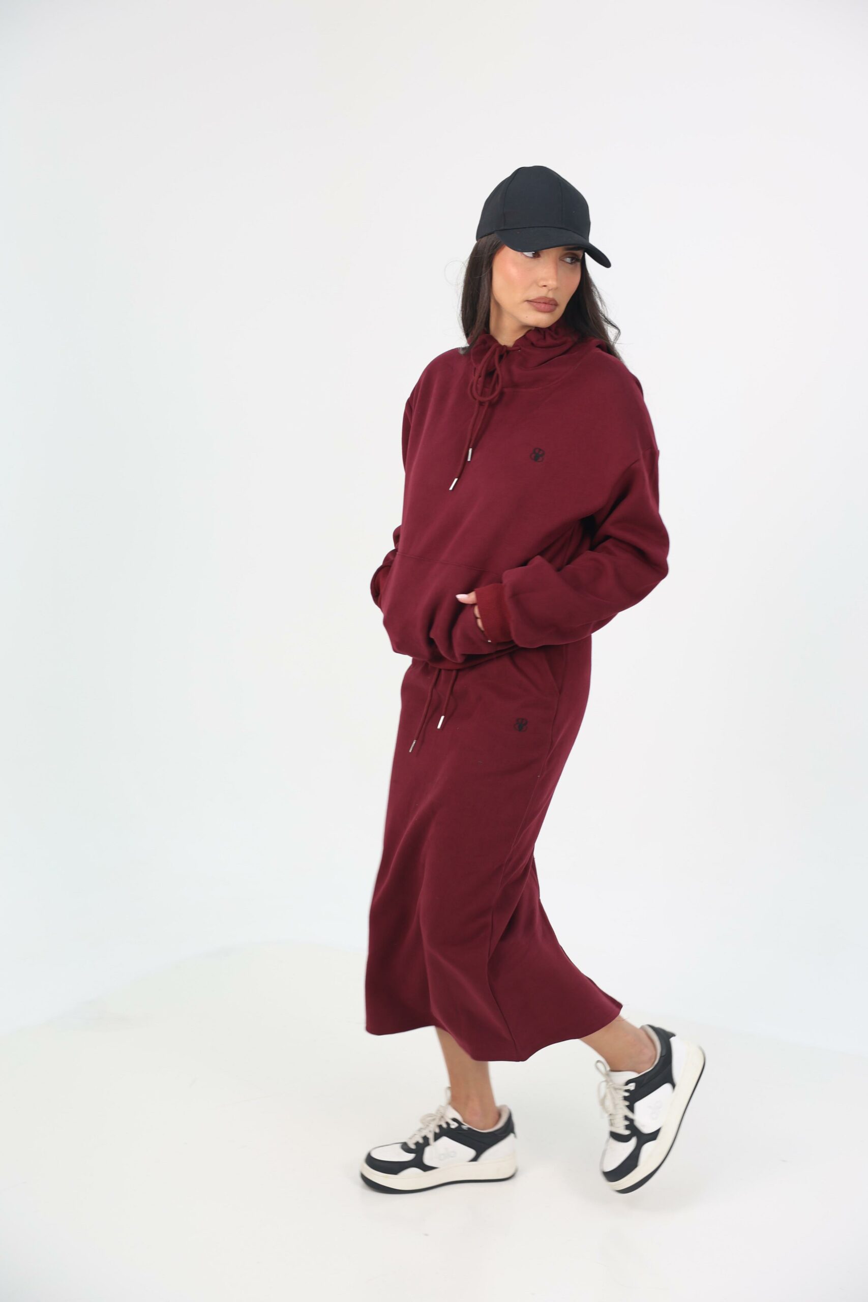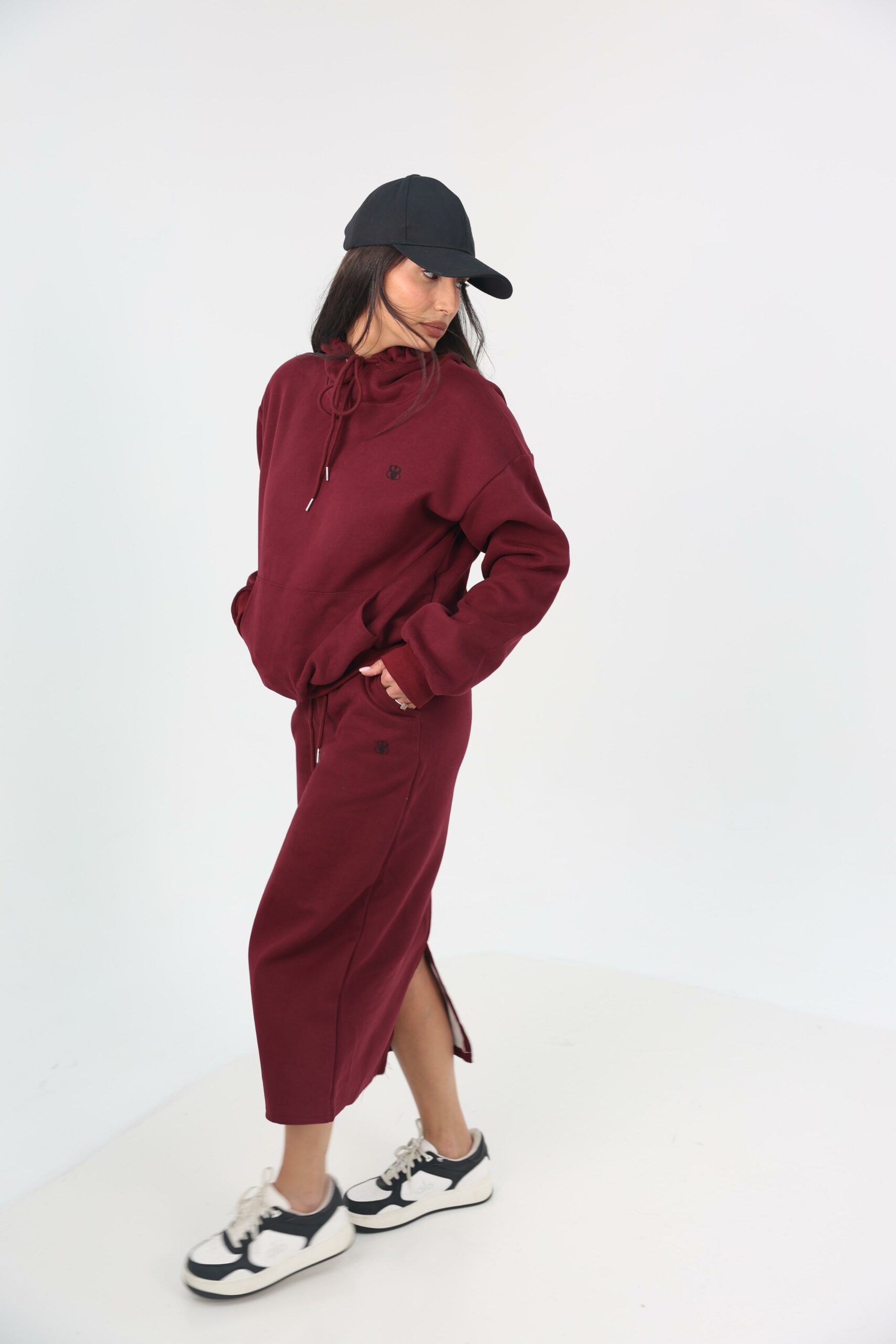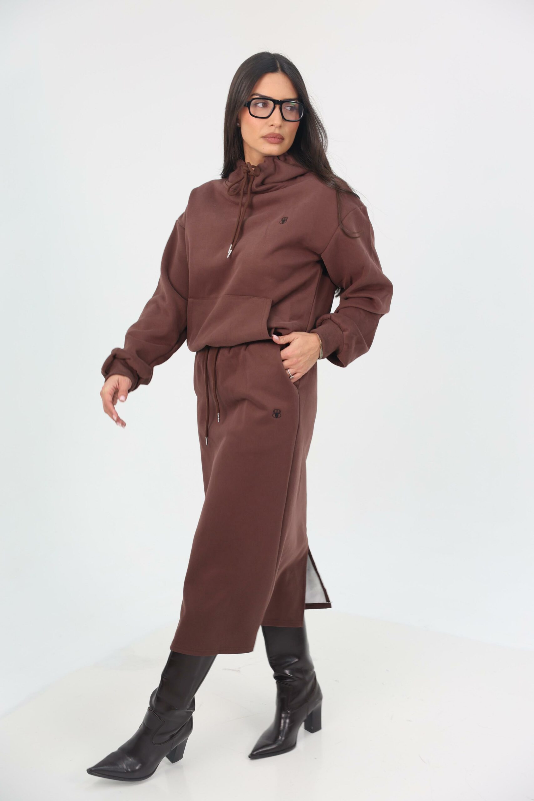 העליונית מגיעה עם קפוצון שרוך צוואר מודגש, כיס קנגורו קדמי וריב עדין בשרוולים, לצד חצאית מקסי מחמיאה עם שסע צדדי לנוחות ותנועה טבעית.