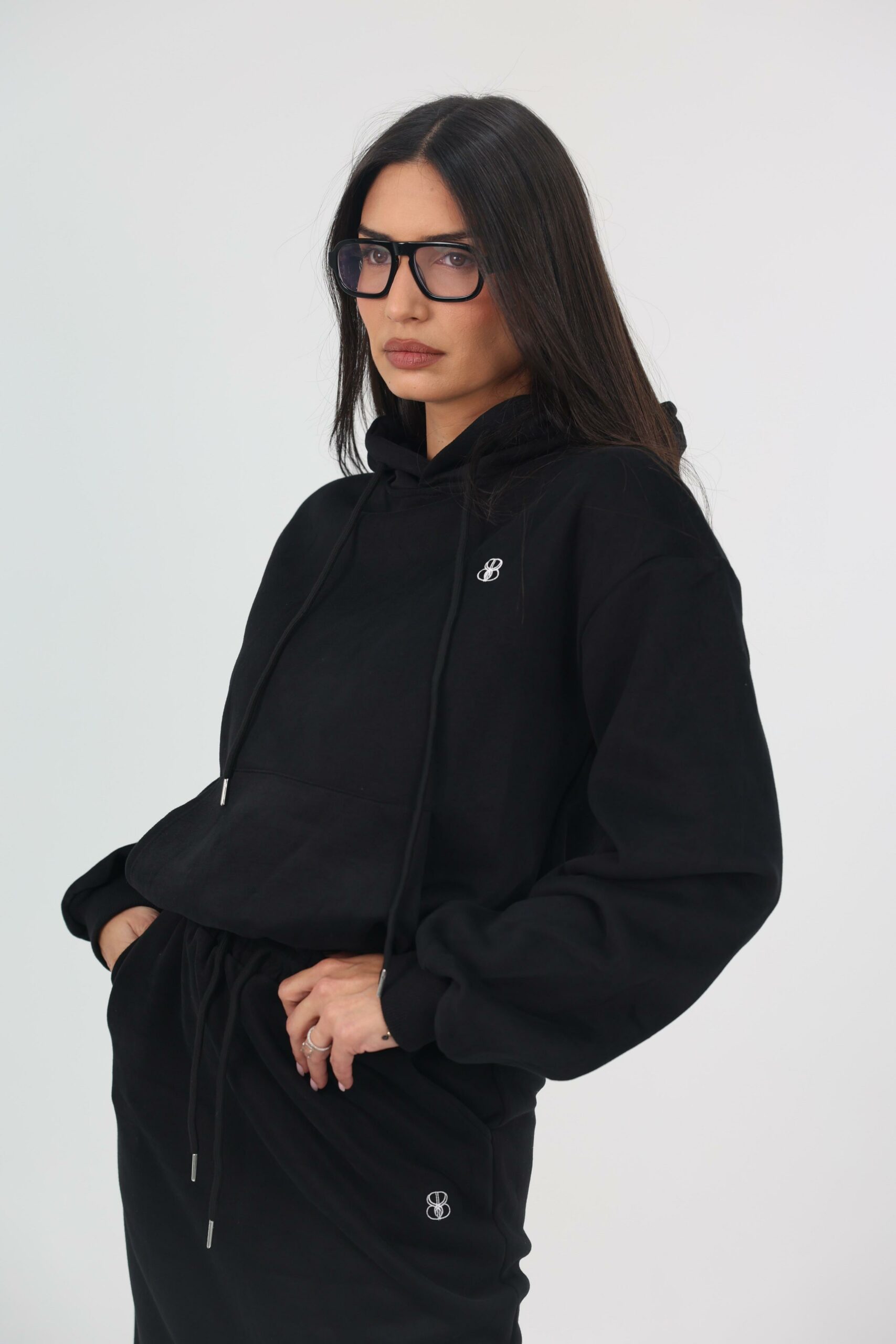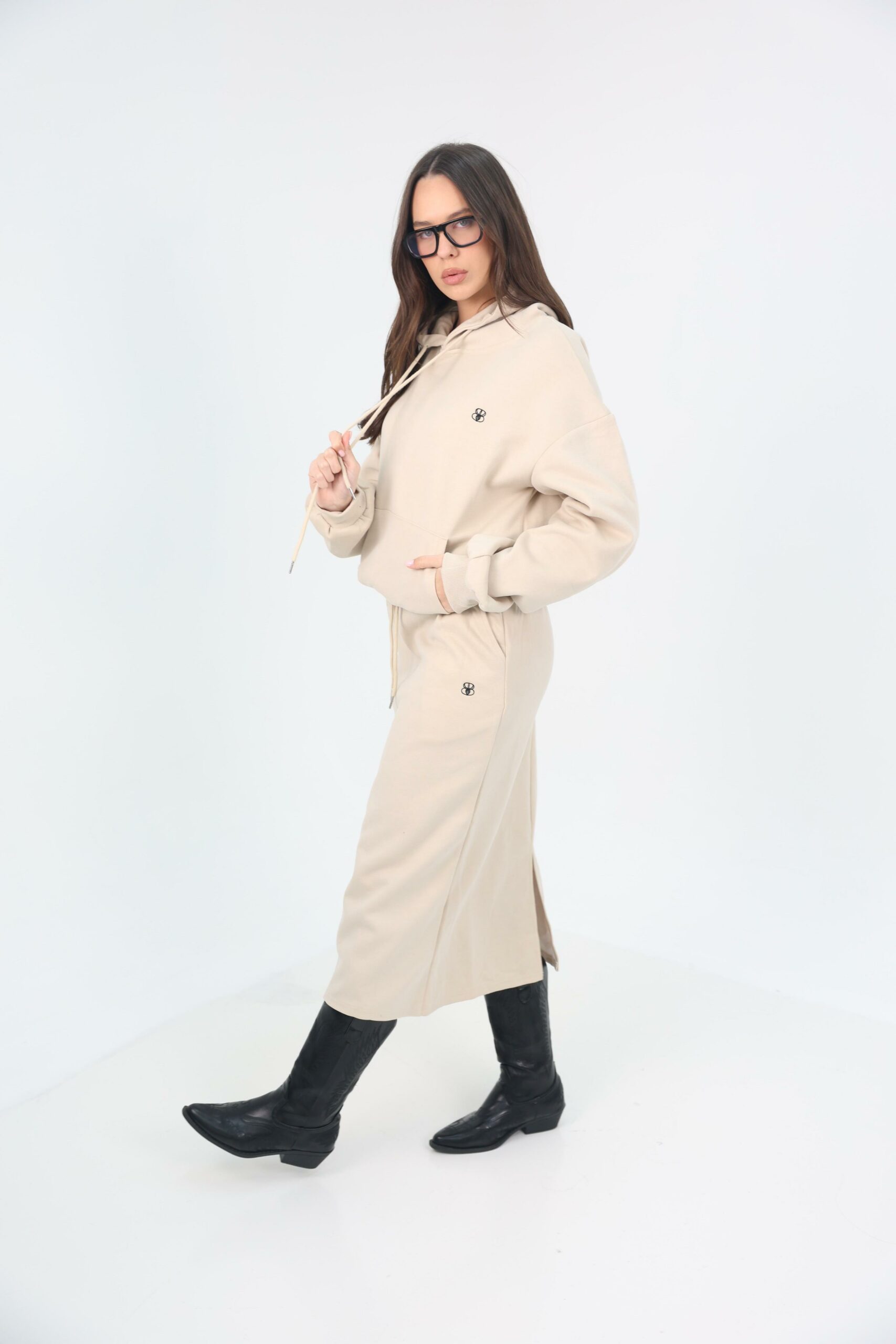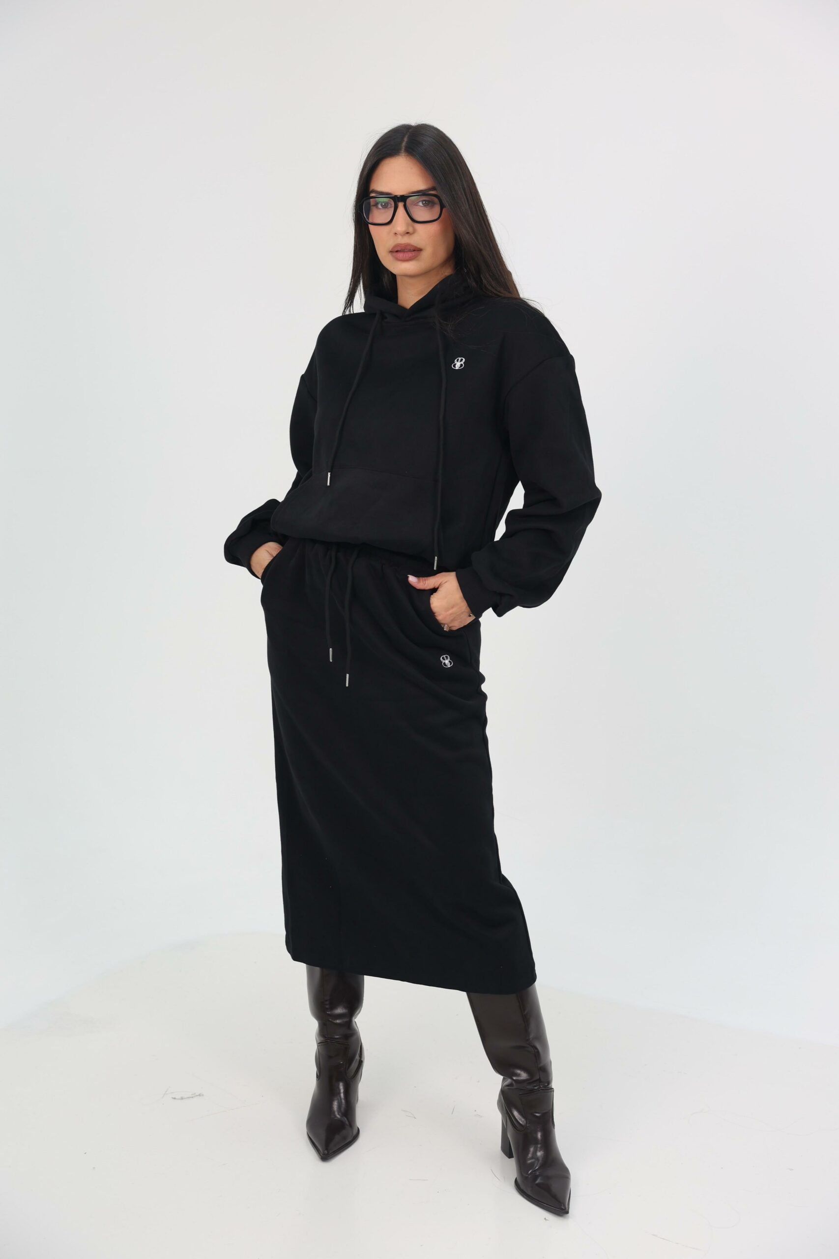העליונית מגיעה עם קפוצון שרוך צוואר מודגש, כיס קנגורו קדמי וריב עדין בשרוולים, לצד חצאית מקסי מחמיאה עם שסע צדדי לנוחות ותנועה טבעית.