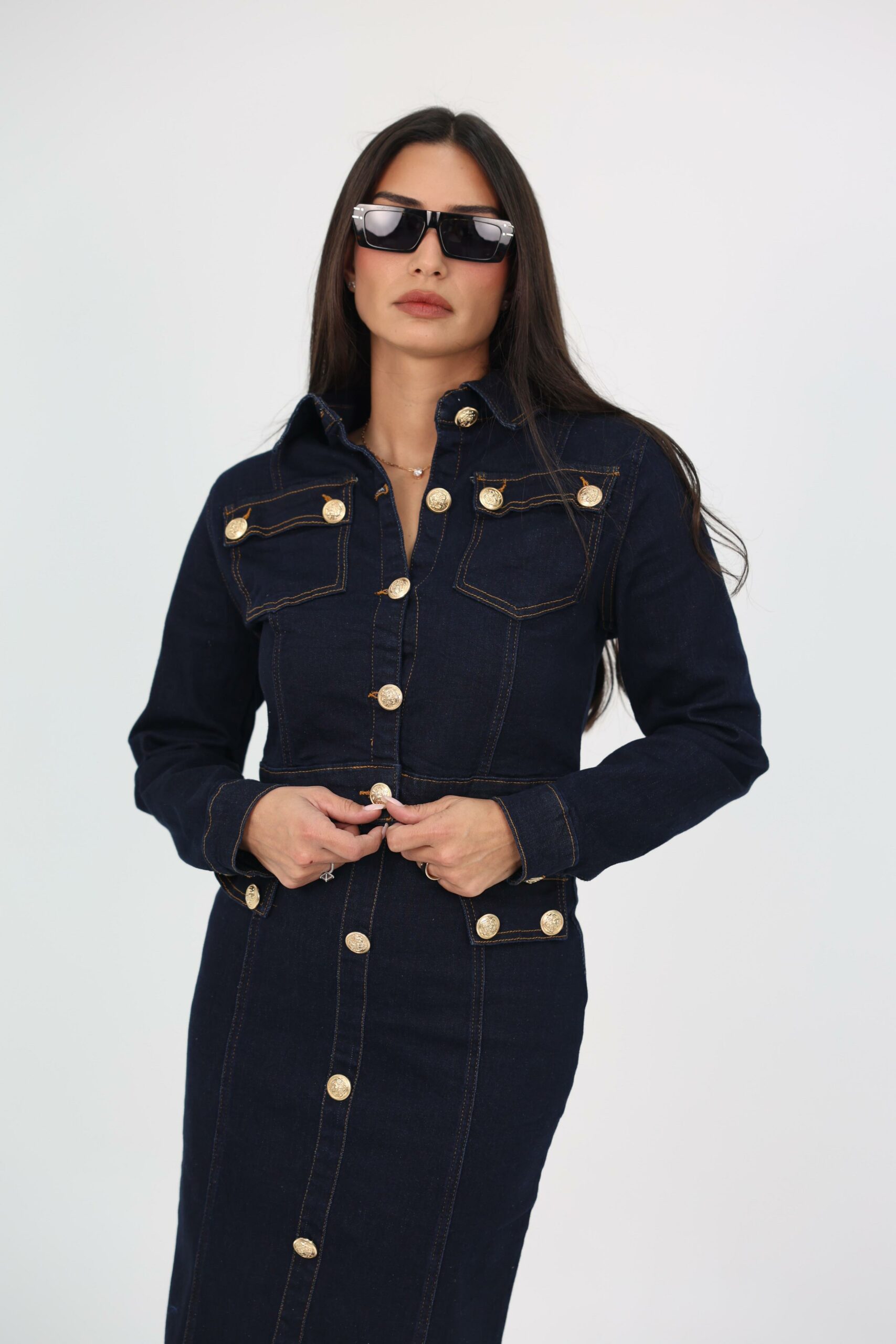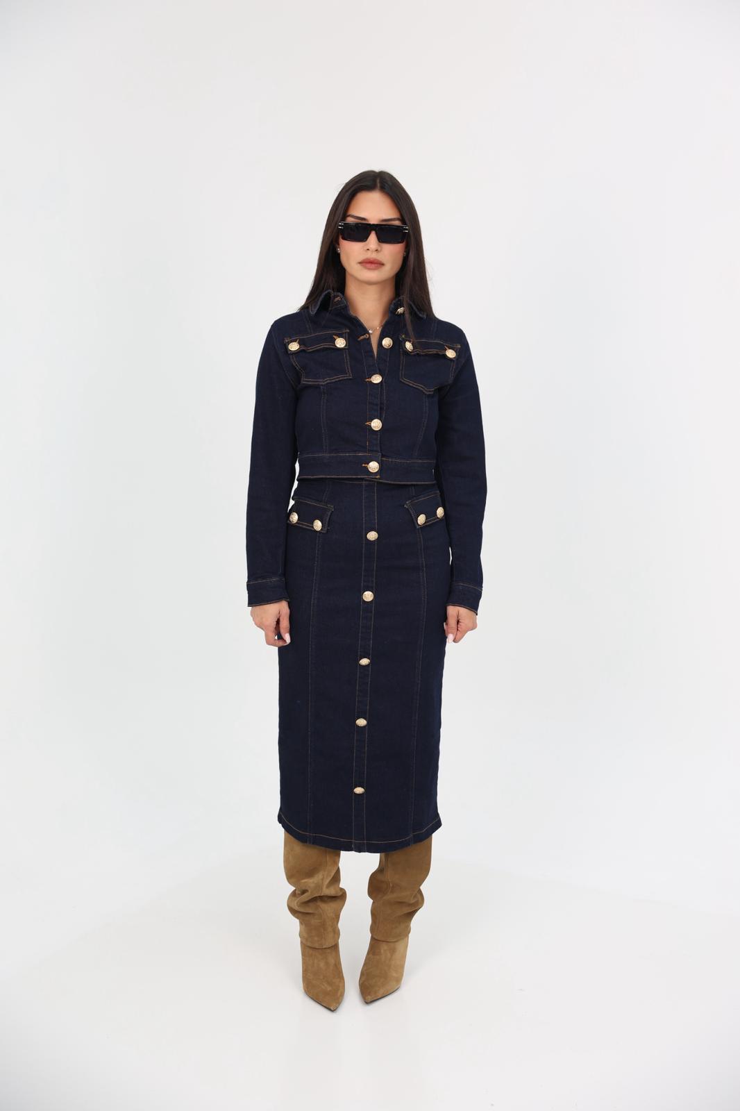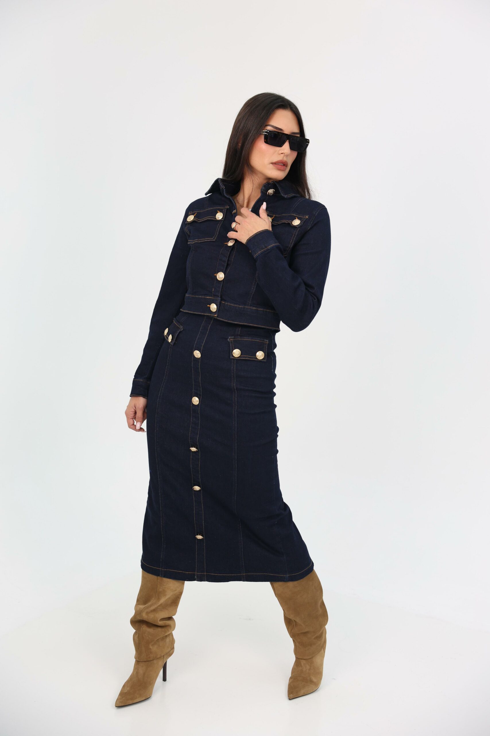 חליפת גינס מחויטת יוקרתית, הכוללת ז’קט מחויט עם כפתורי זהב דומיננטיים וחצאית מידי תואמת.