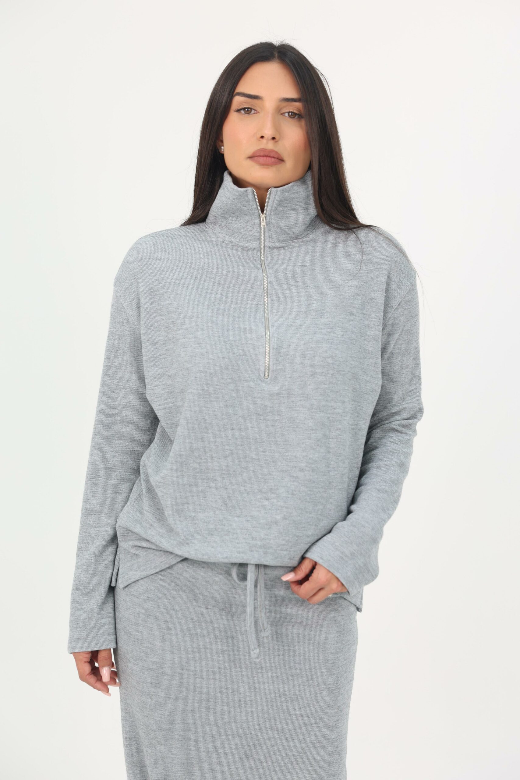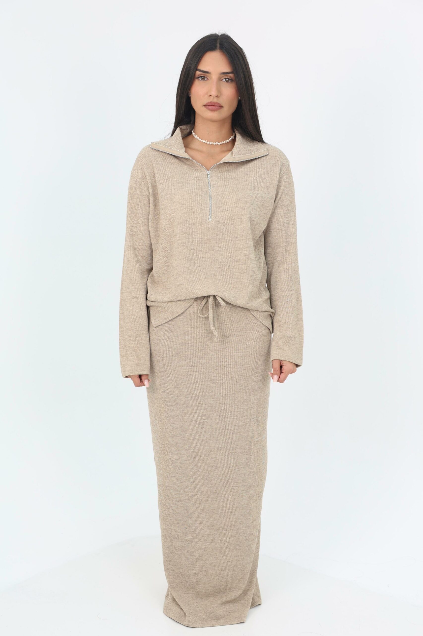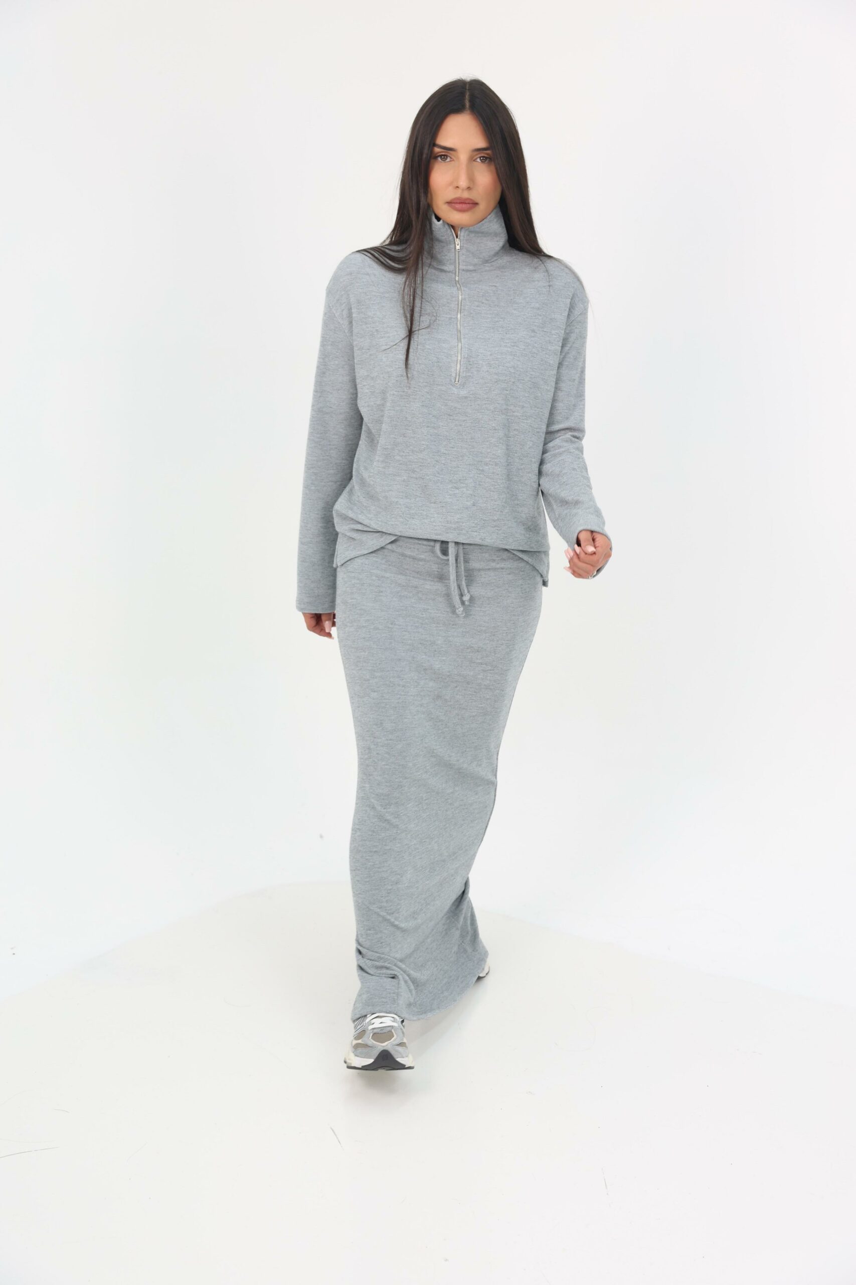 חליפת בייסיק חולצת אוברסייז צווארון ריצ'רץ' חצאית מקסי מנג'ט גומי נוחה בטירוף.