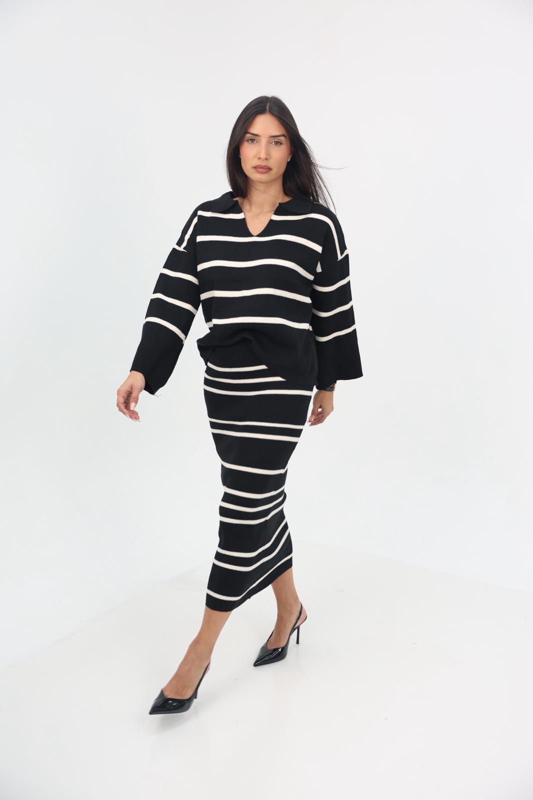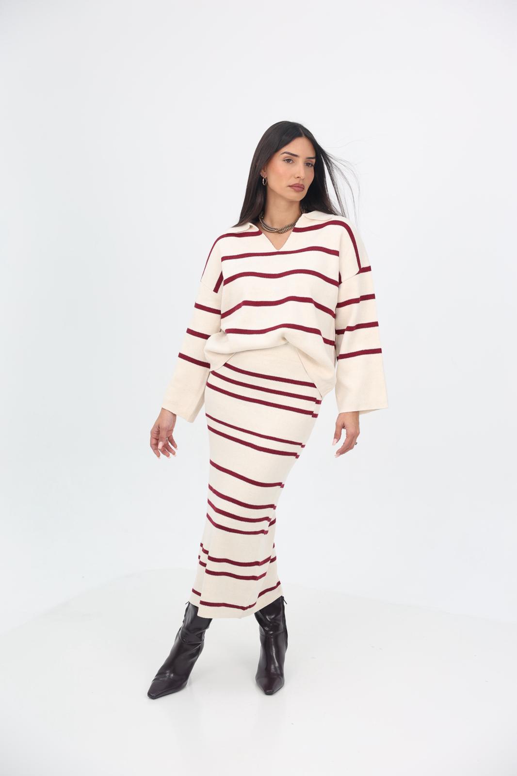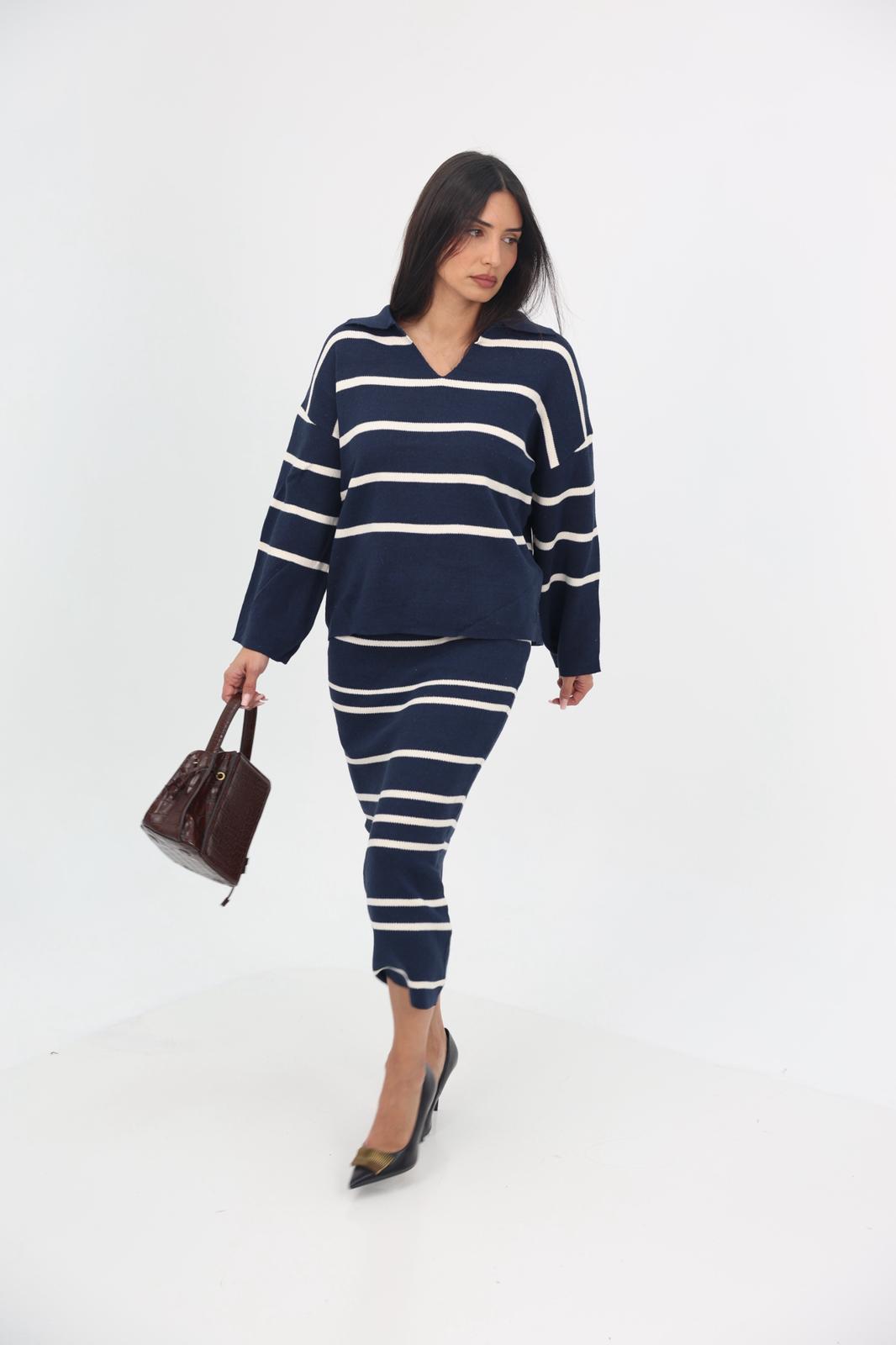 חליפת סריג אלגנטית ונעימה הכוללת עליון בגזרת V נינוחה וחצאית תואמת עם מנג’ט גומי למראה נשי ומחמיא.