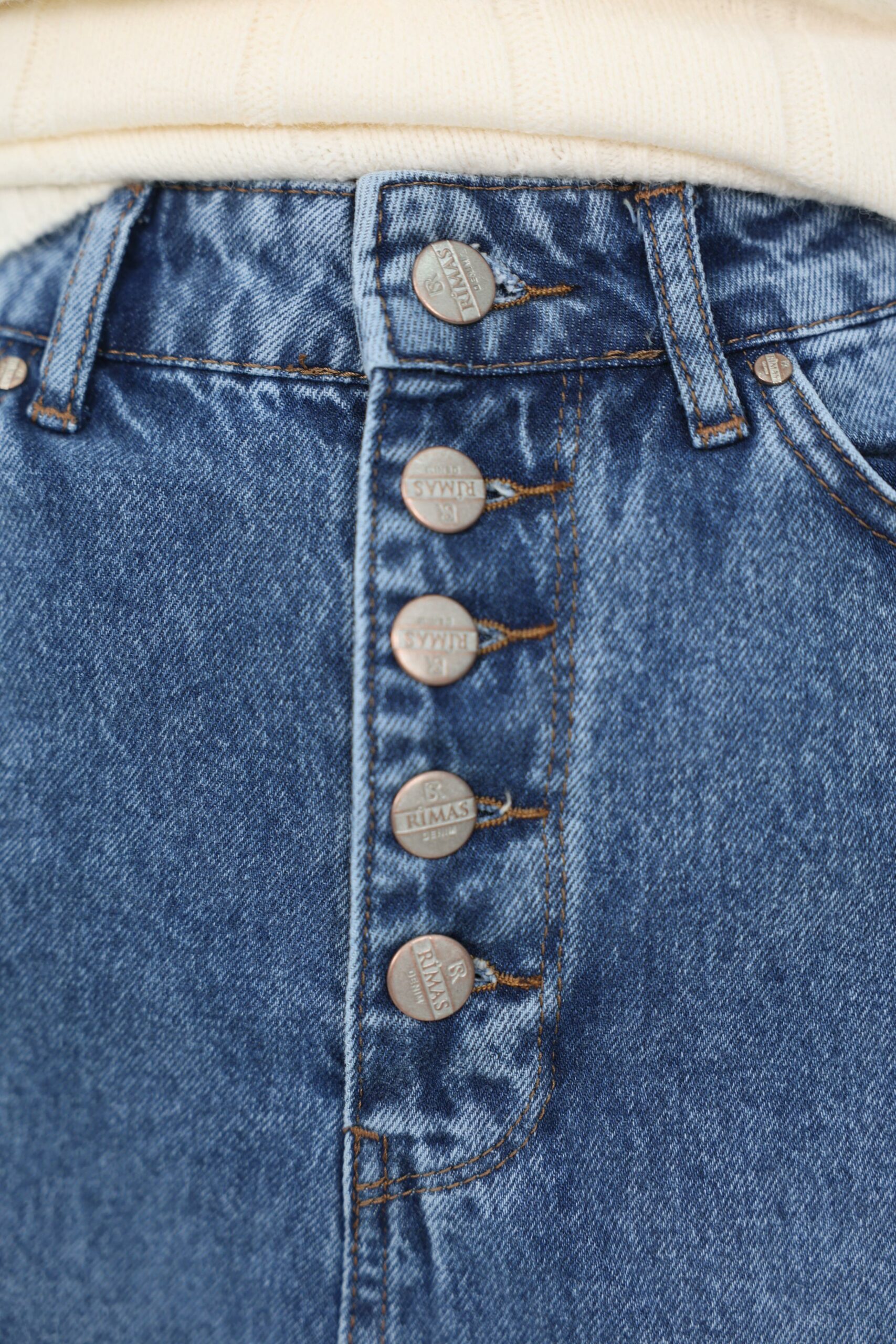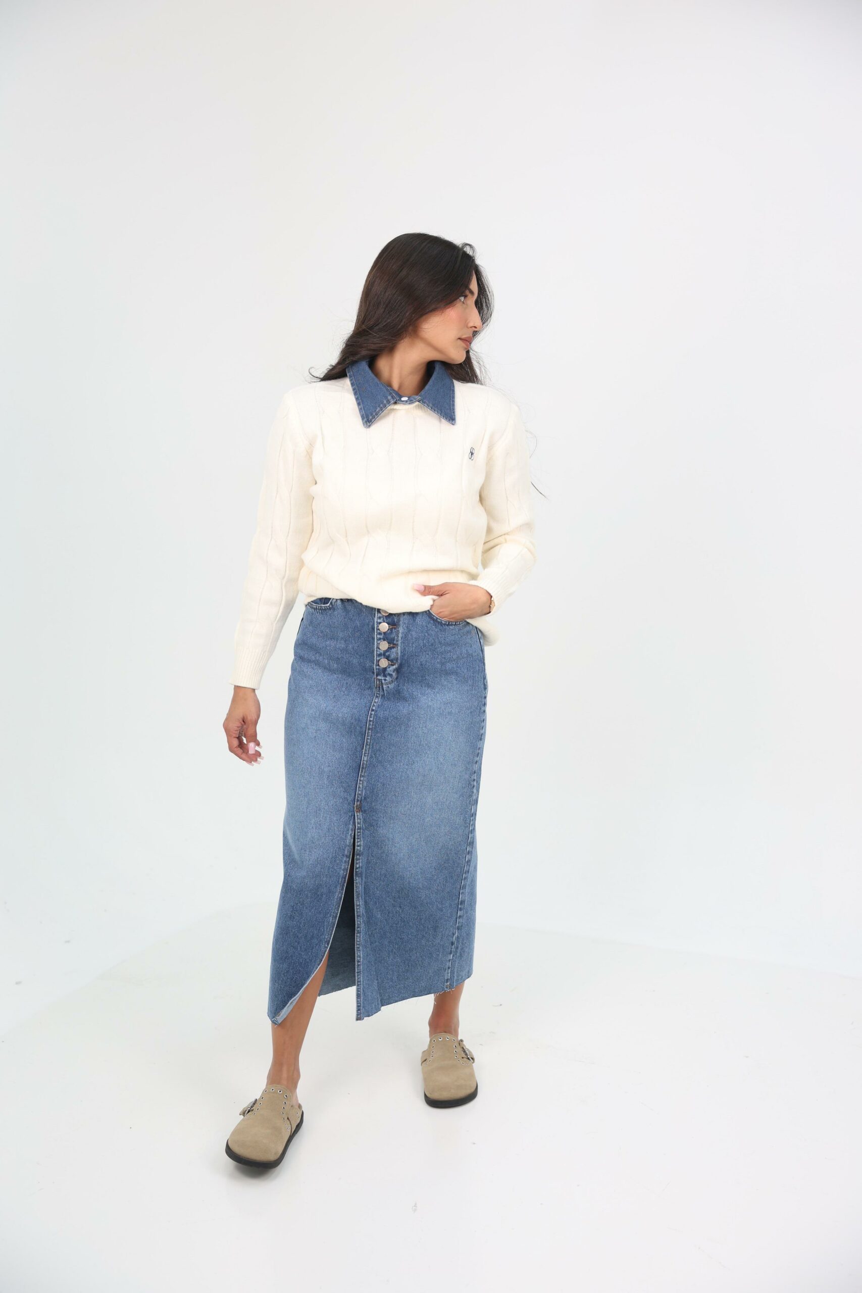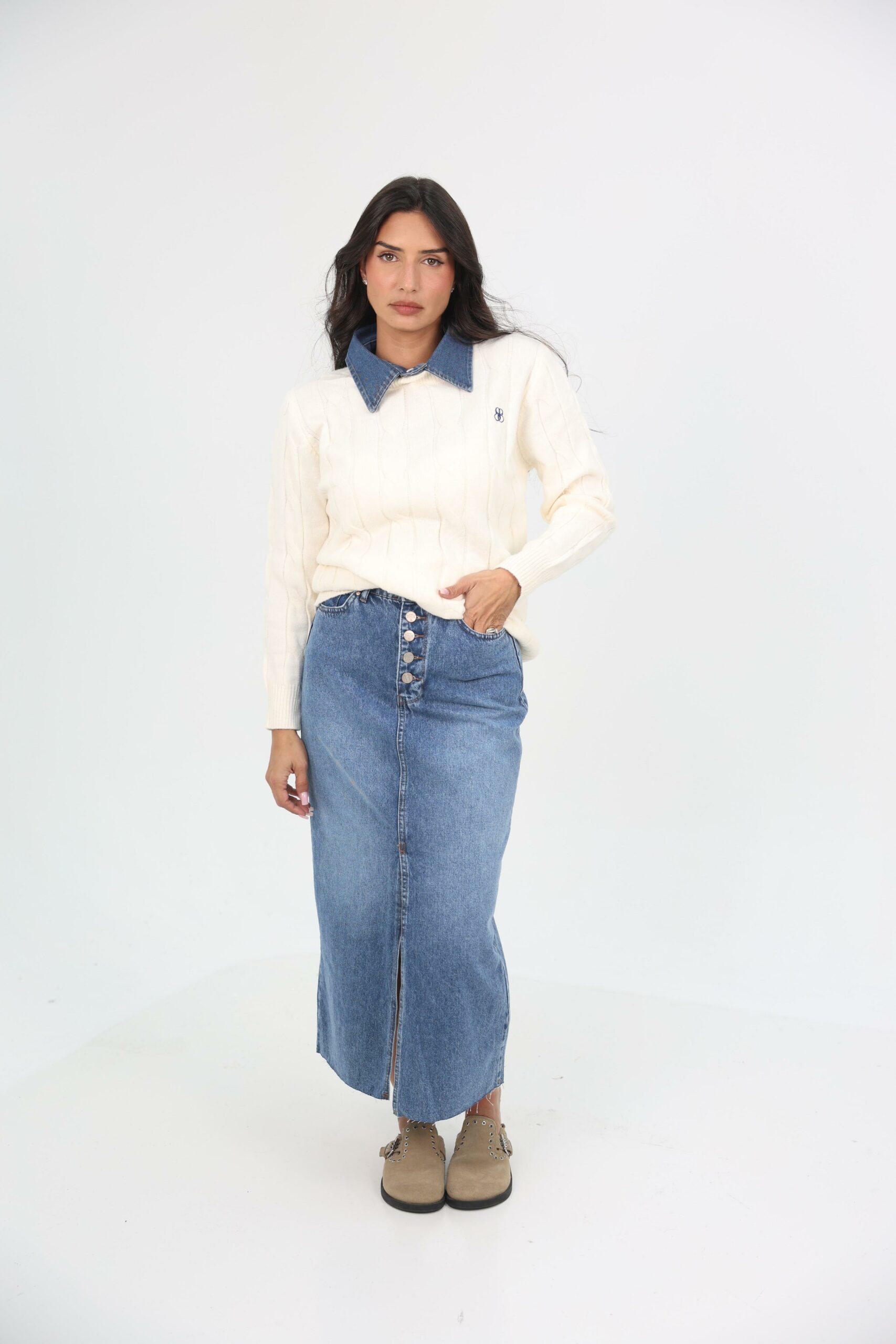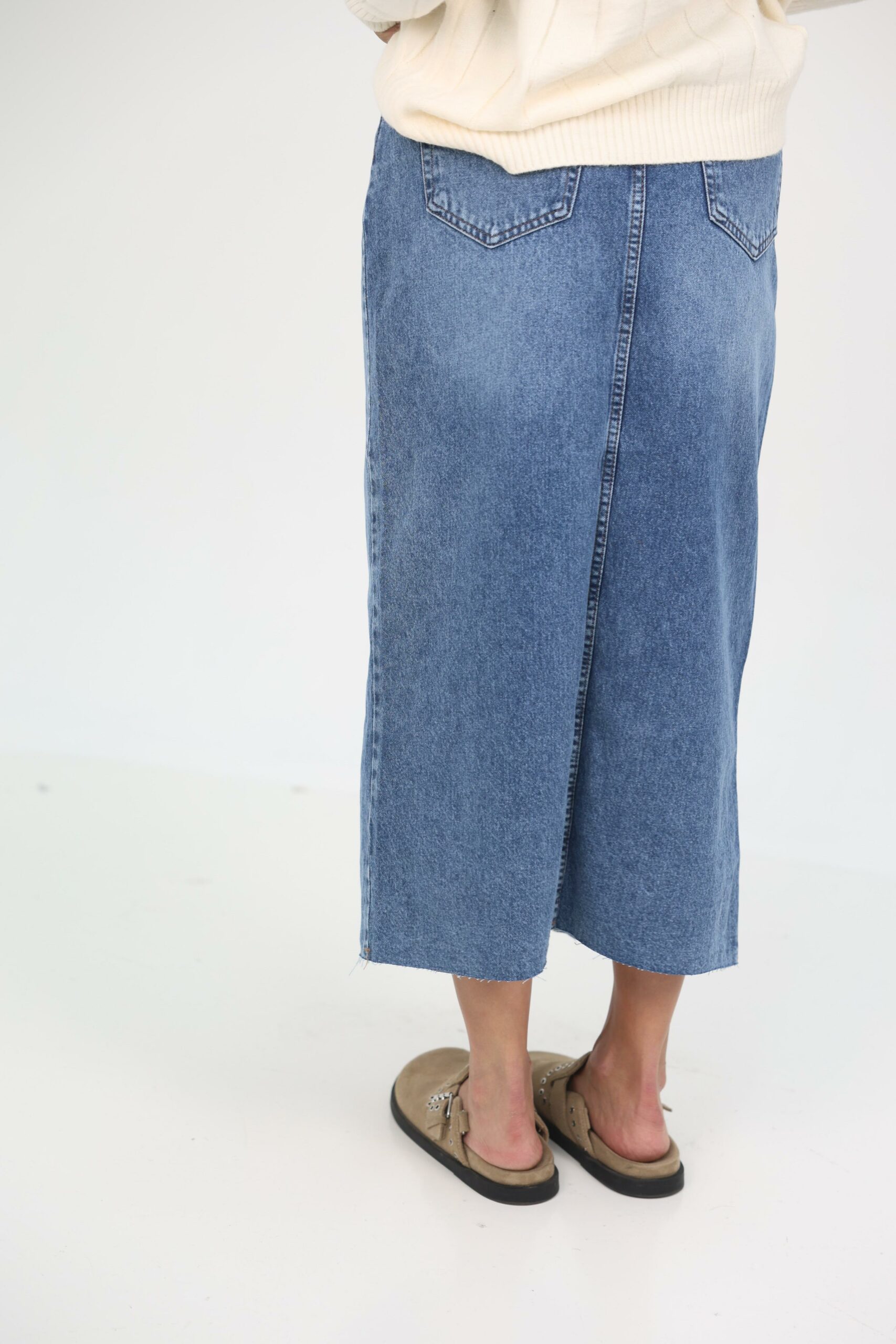חצאית ג’ינס קלאסית בגזרת מקסי ישרה, עשויה דנים איכותי ונוח ליום-יום.