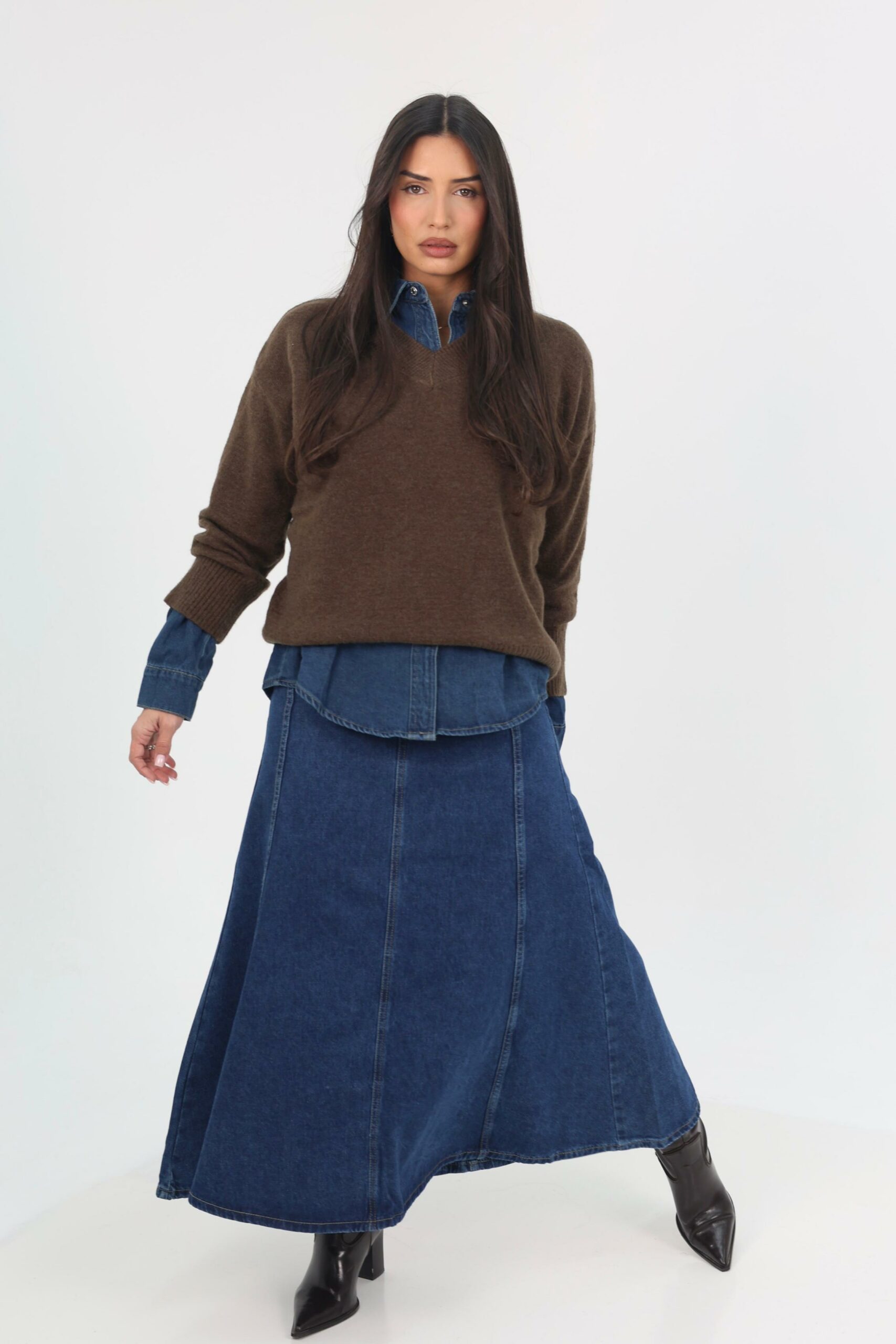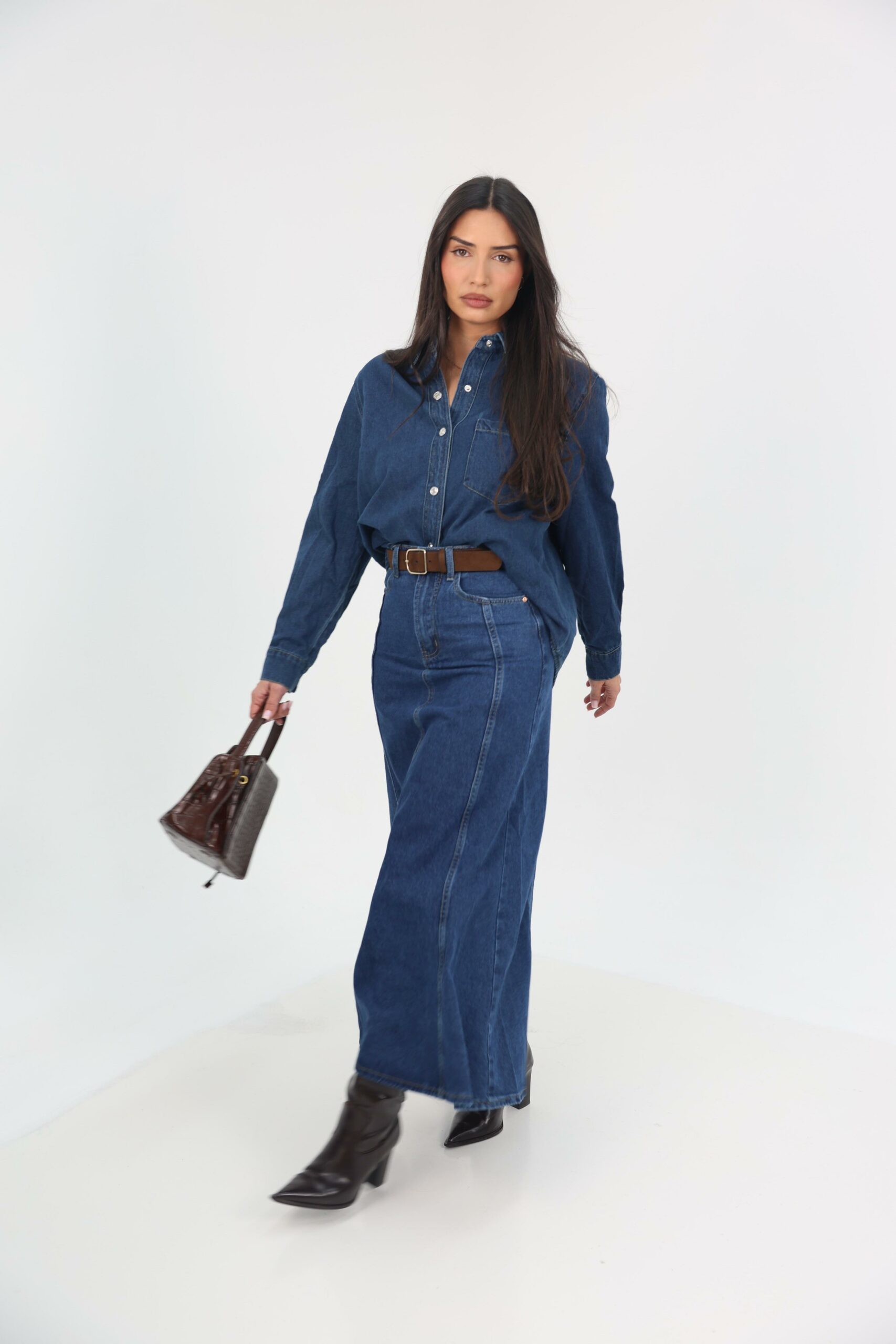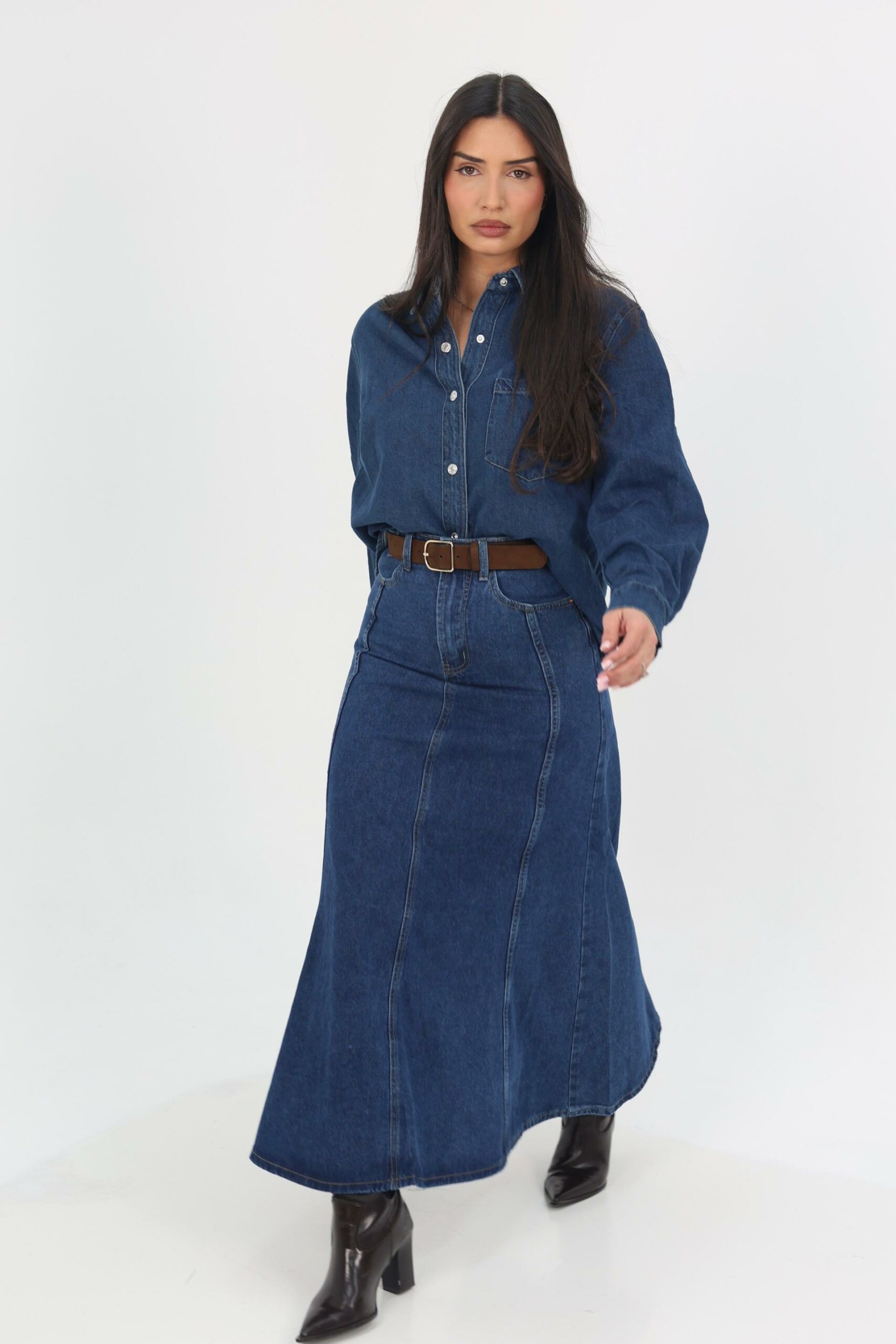 חצאית דנימ נשית ומדויקת בגזרת מקסי מתרחבת, היושבת מחמיא על הגוף ומעניקה מראה אלגנטי ובלתי מתאמץ.