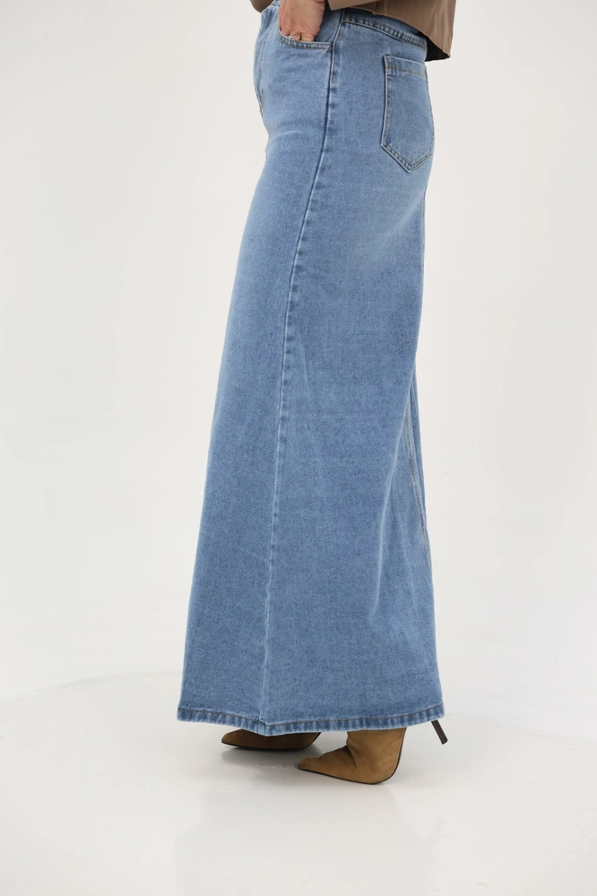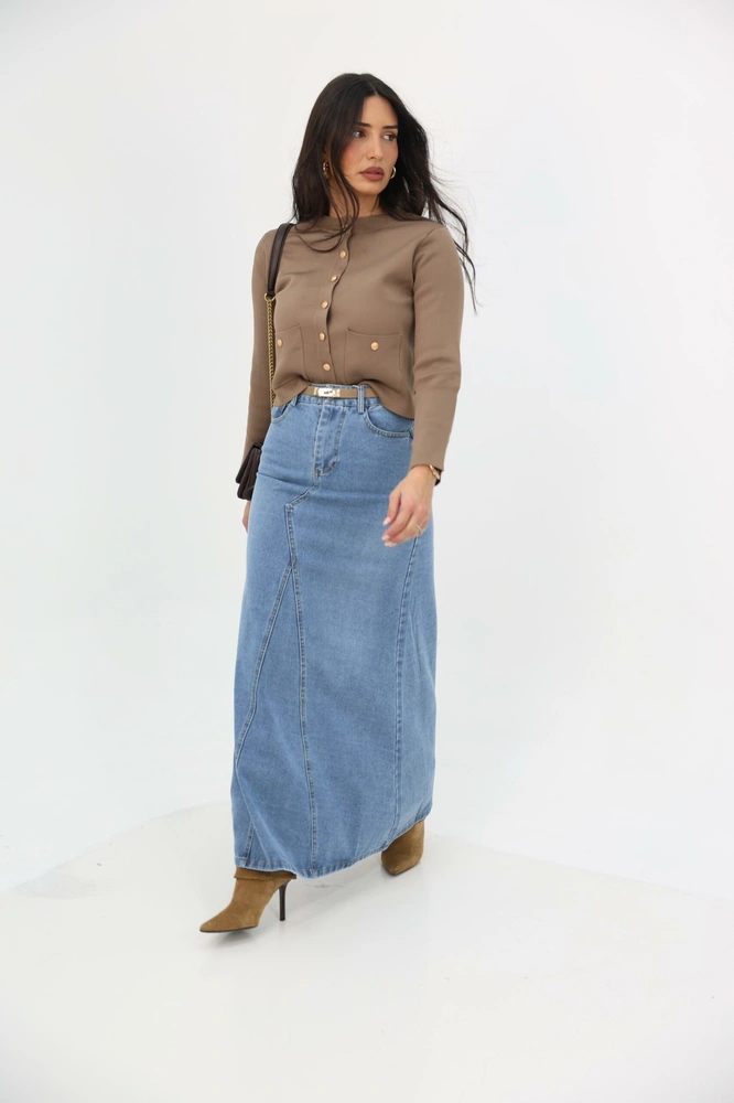 חצאית ג׳ינס ארוכה בגזרה מחמיאה ונוחה, עשויה בד ג׳ינס איכותי עם תפרים אלכסוניים למראה נקי ומדויק. פריט על־זמני שמשתלב בקלות עם כל לוק יומי או אלגנטי.