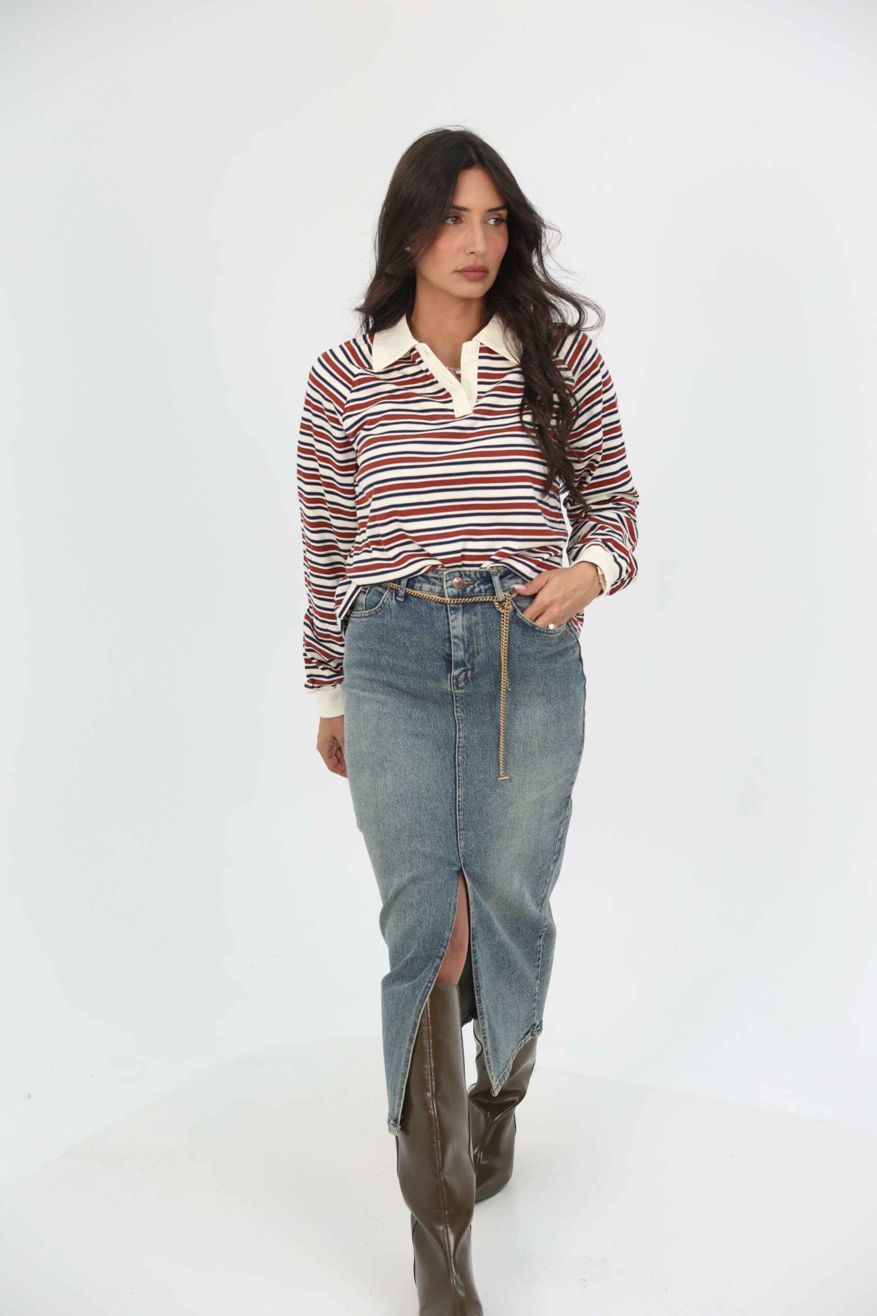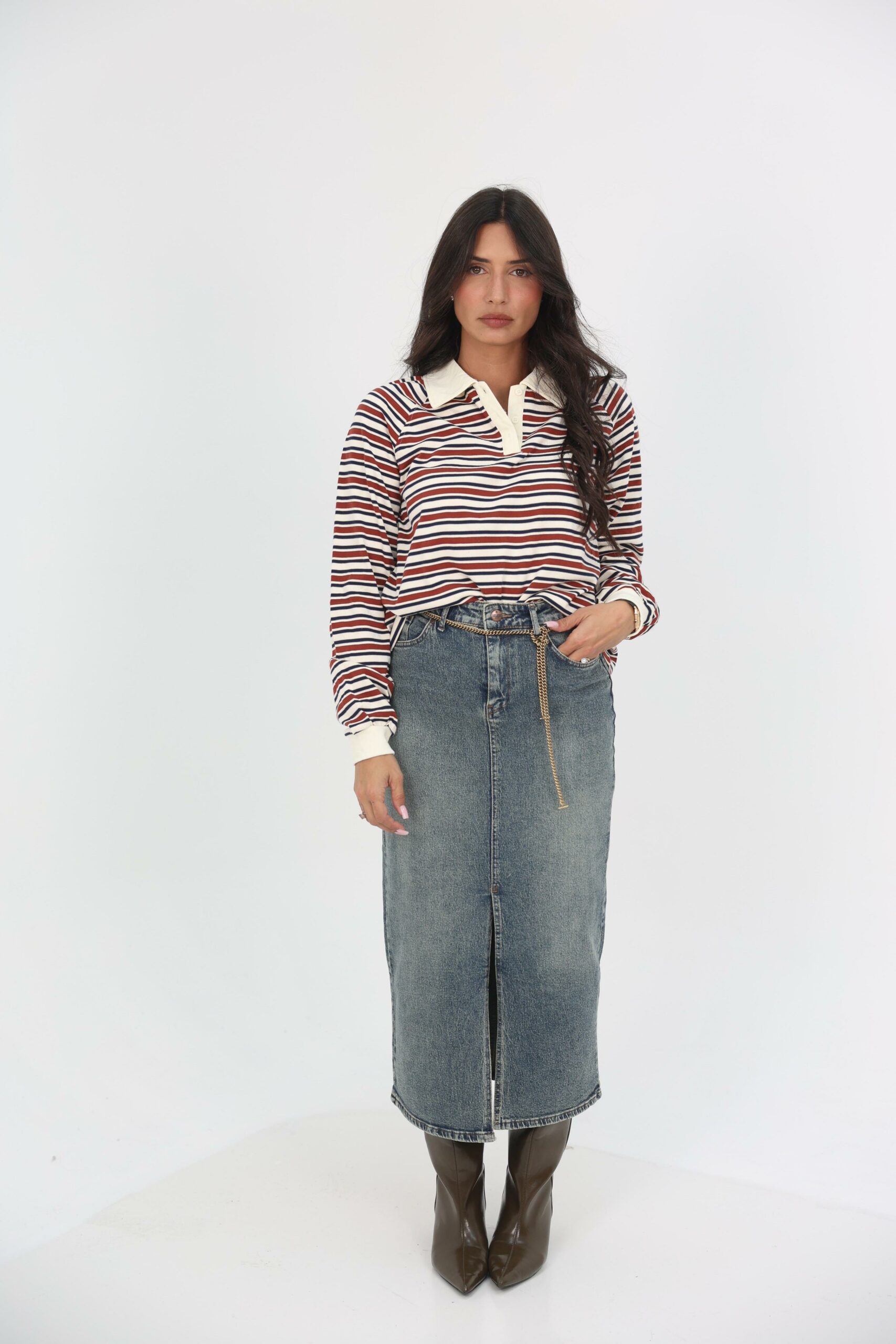 חצאית גינס שסע קידמי בד נוח וגמיש.