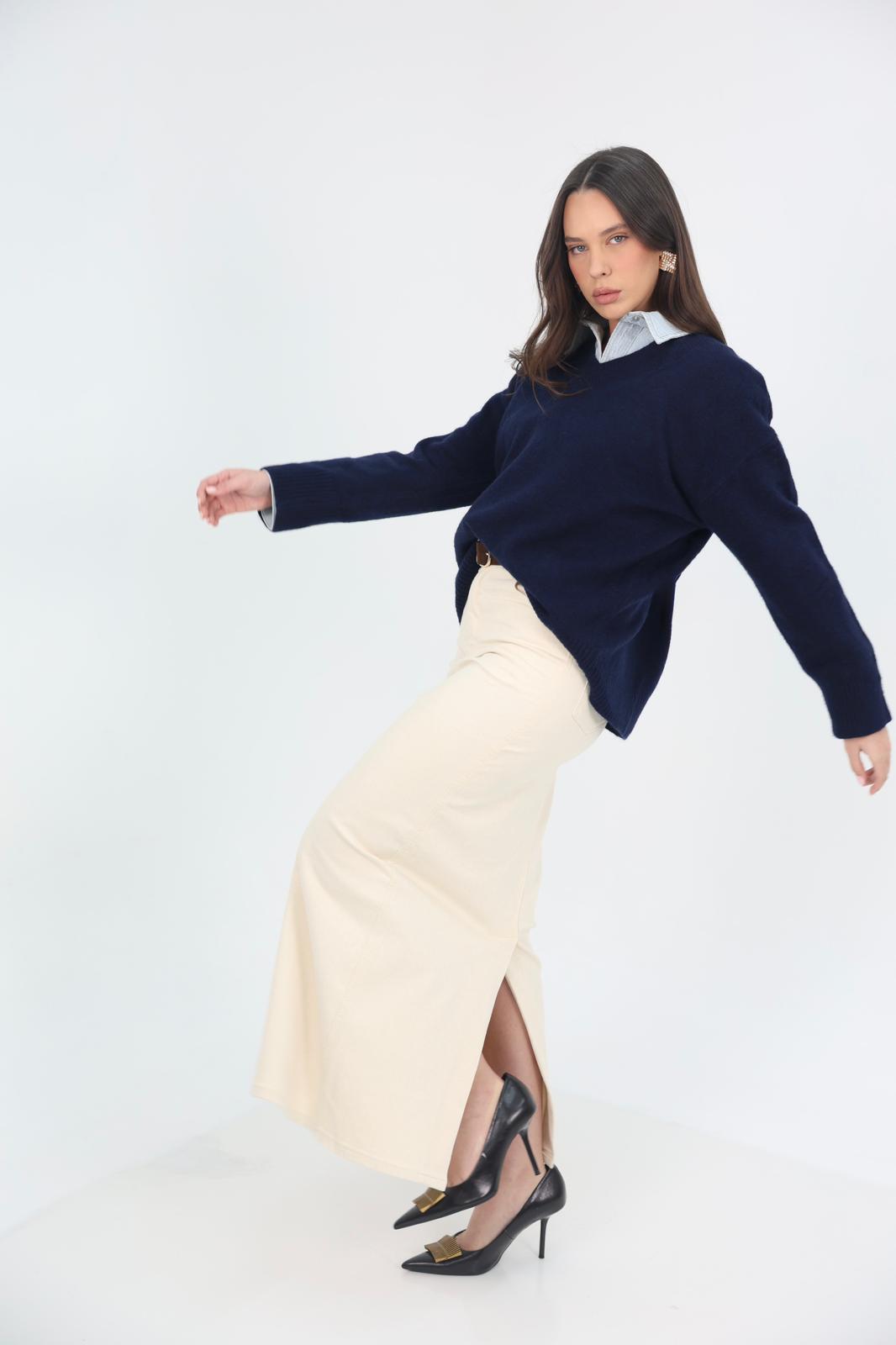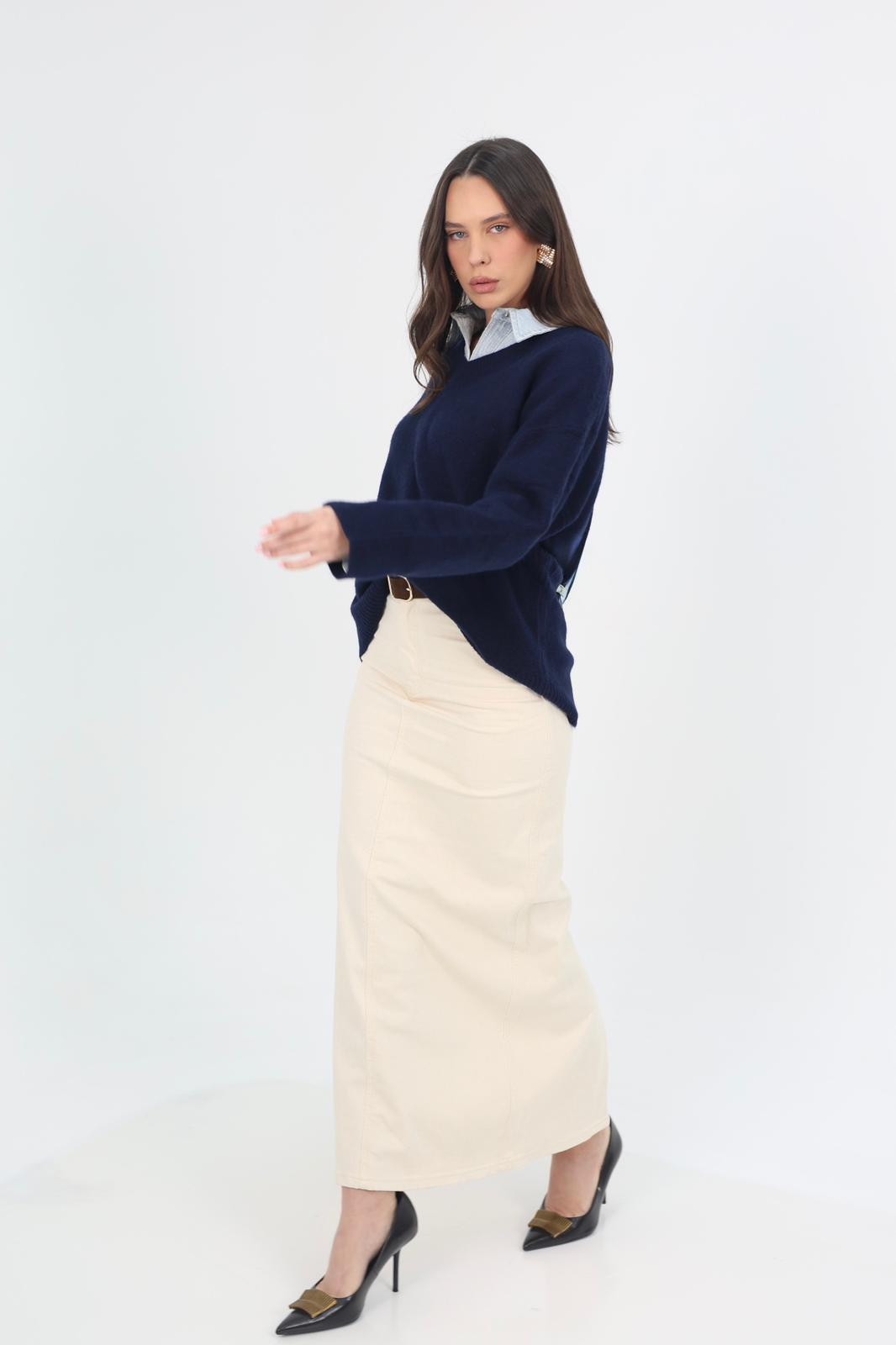 חצאית מקסי נקייה ועל־זמנית בגזרה ישרה ומחמיאה, עשויה בד ג׳ינס לייקרה יציב ונעים שמעניק מראה אלגנטי ומתוחכם.