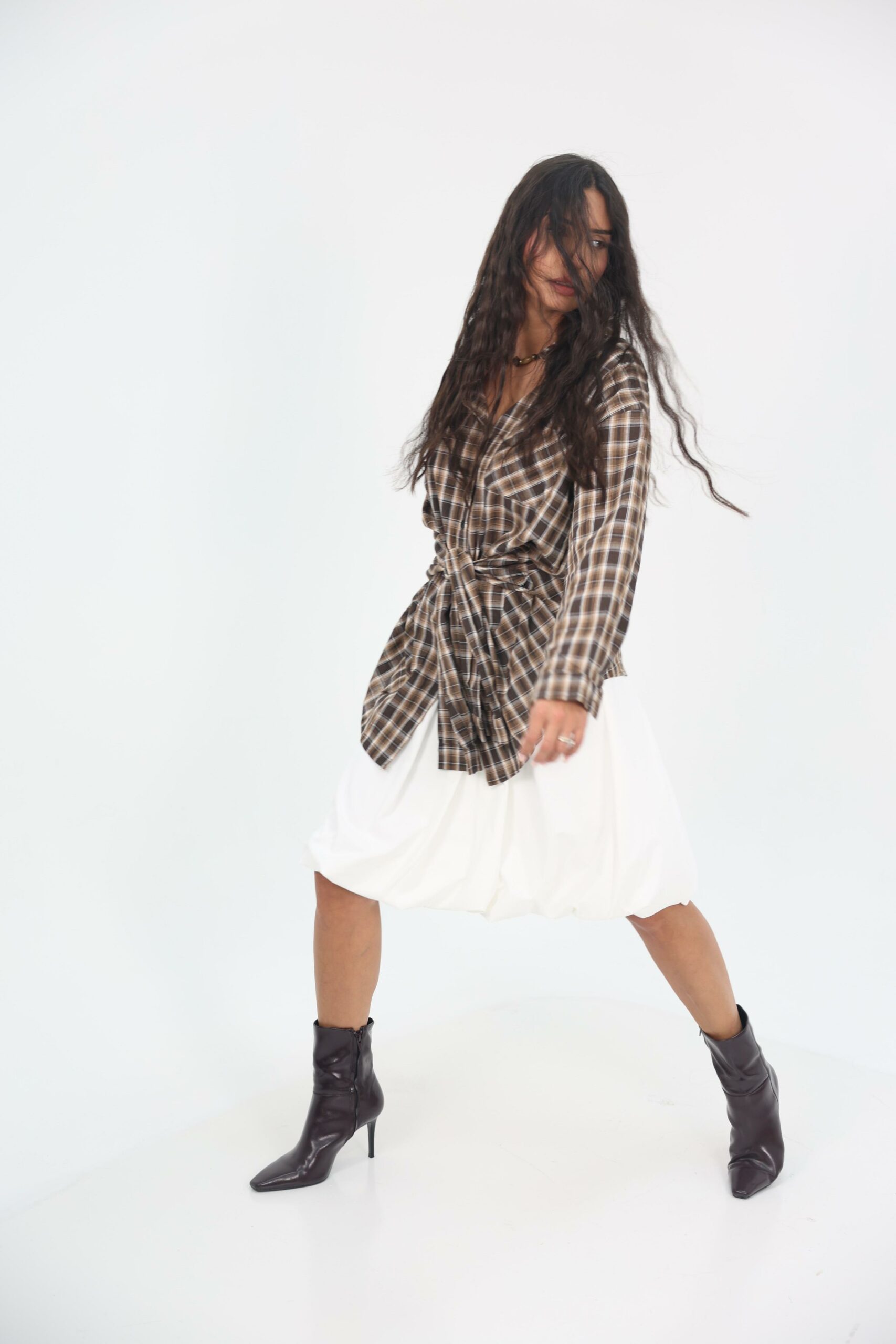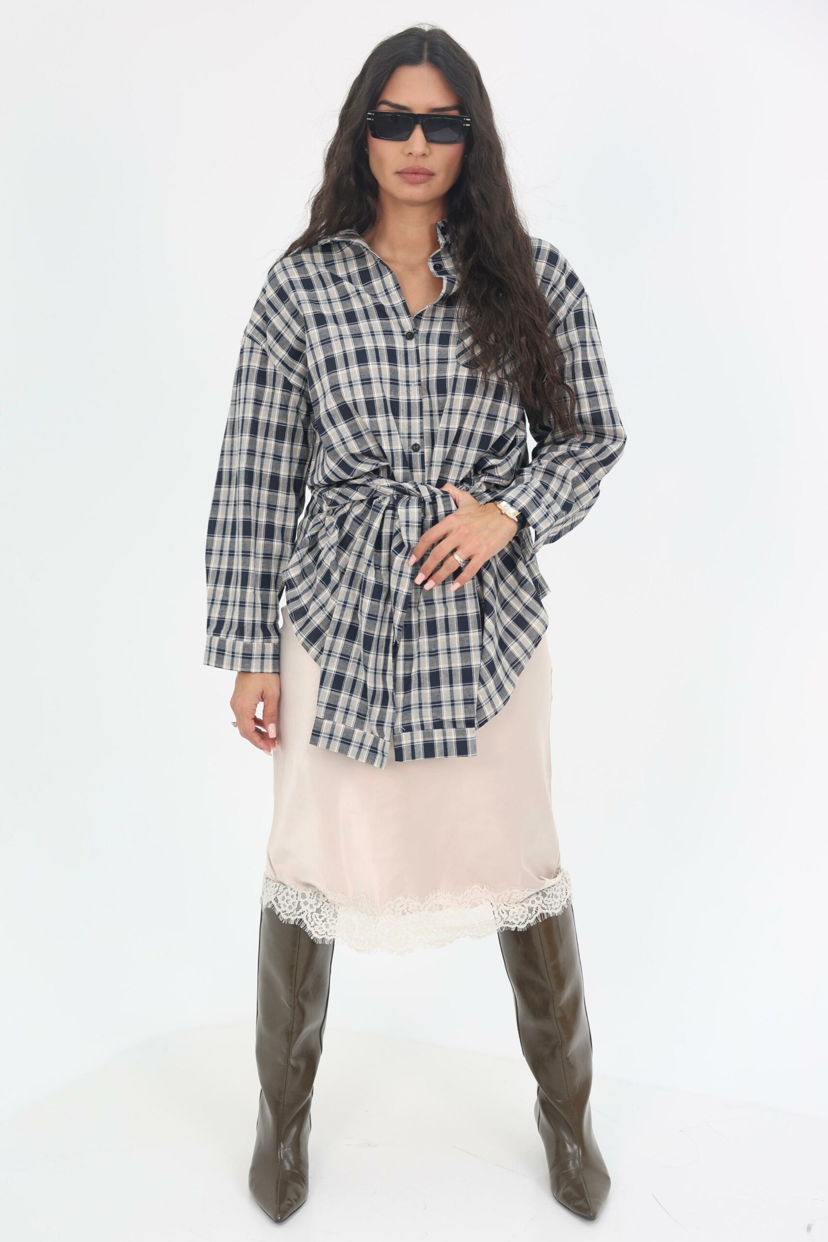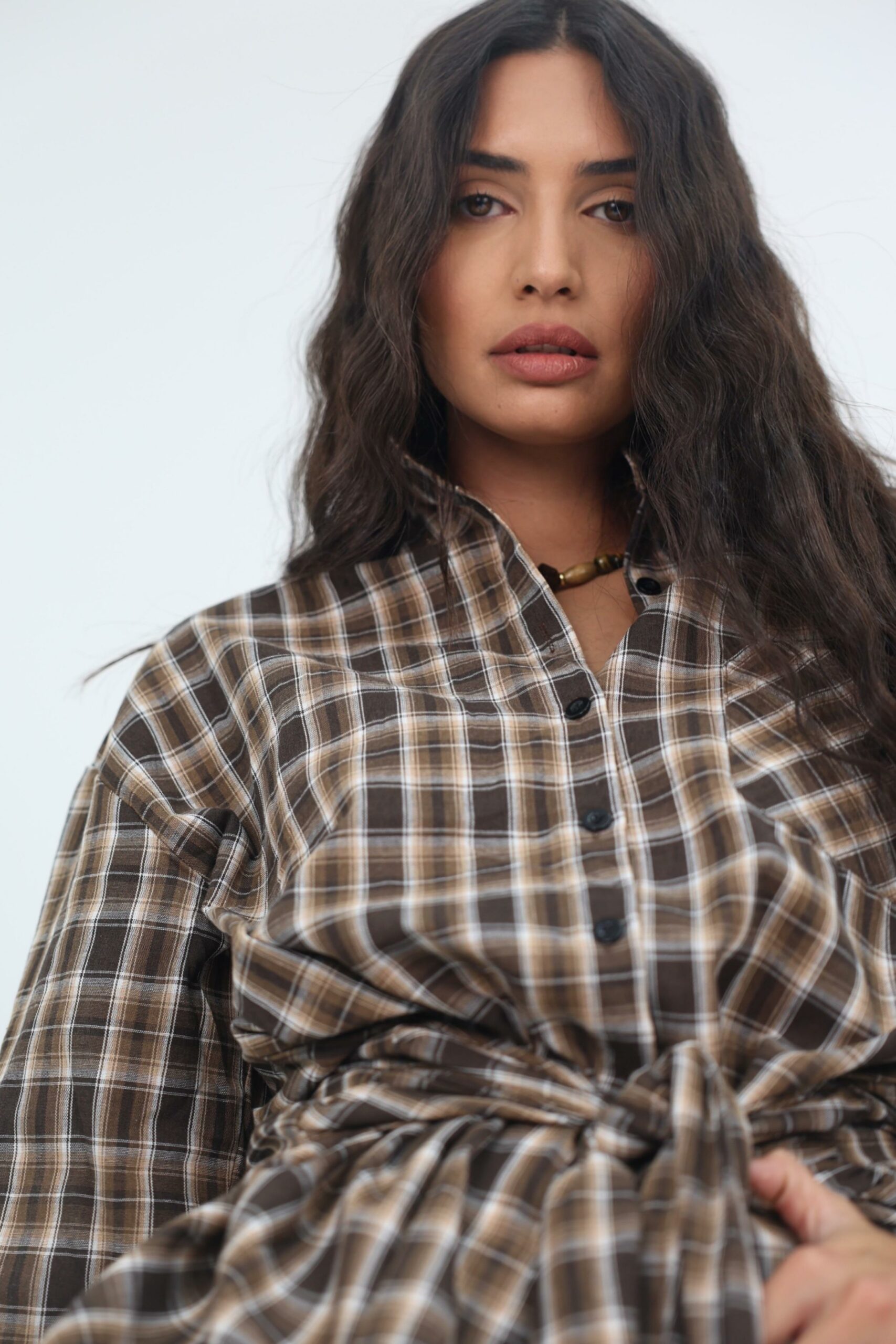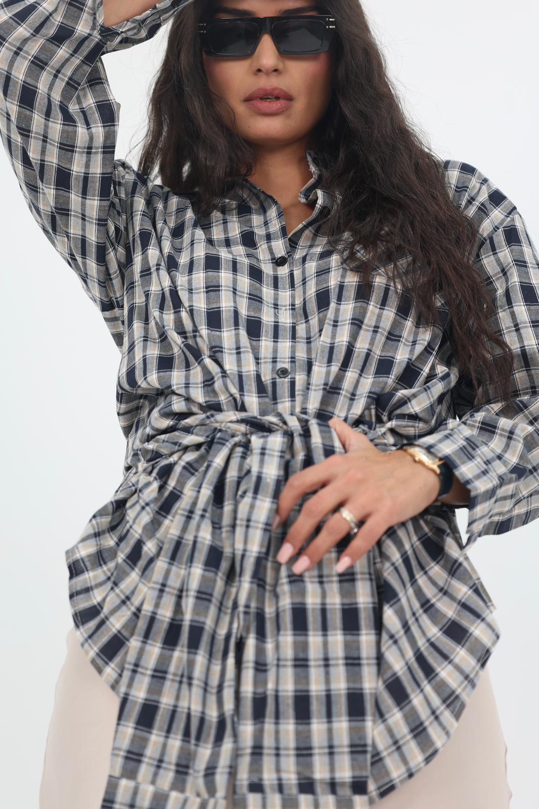 חולצת כפתורים בגזרת טוניקה, עשויה בד משובץ נעים למגע. מגיעה עם