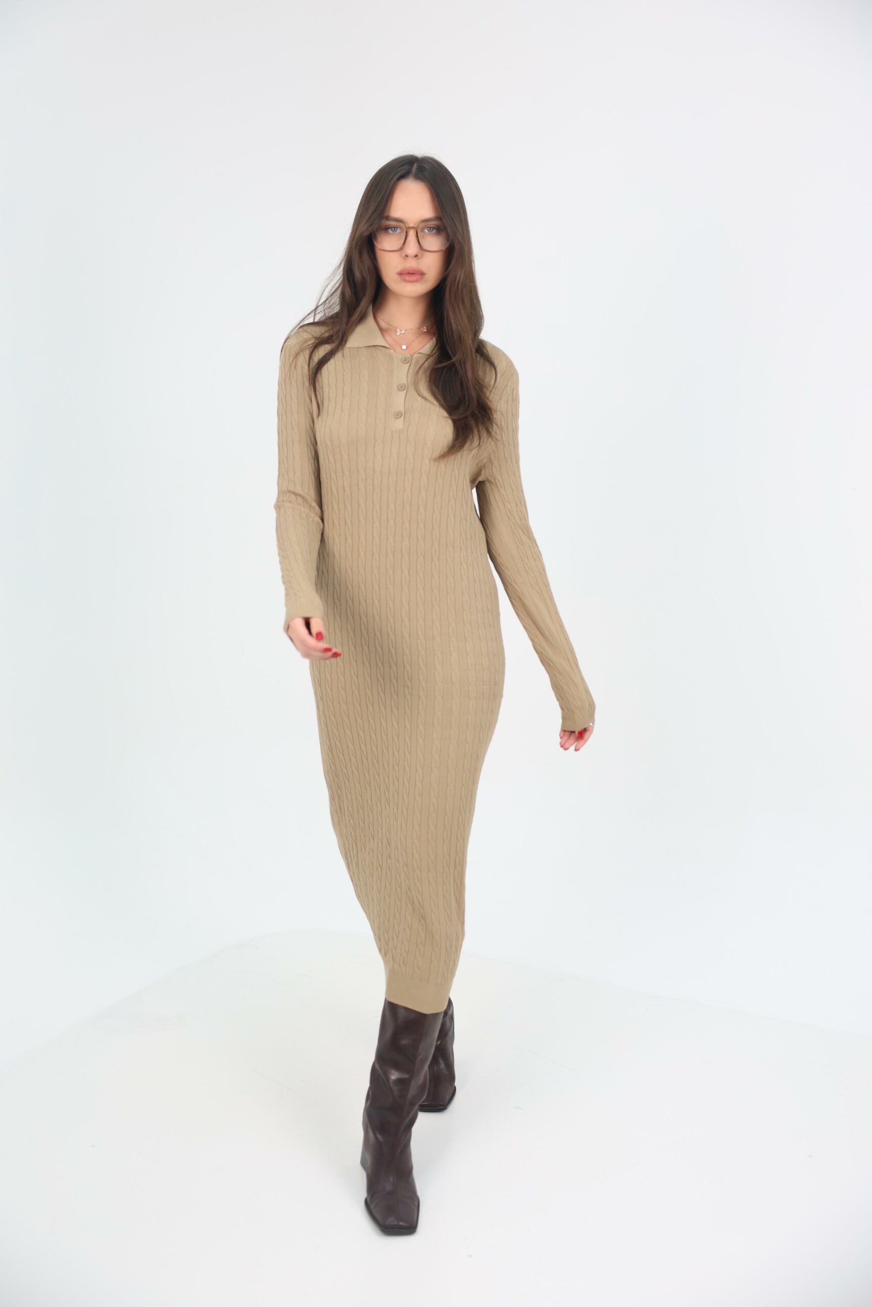 שמלת סריג ארוכה בגזרה נקייה, עשויה בד סריג דק דמוי צמות רך ונעים.