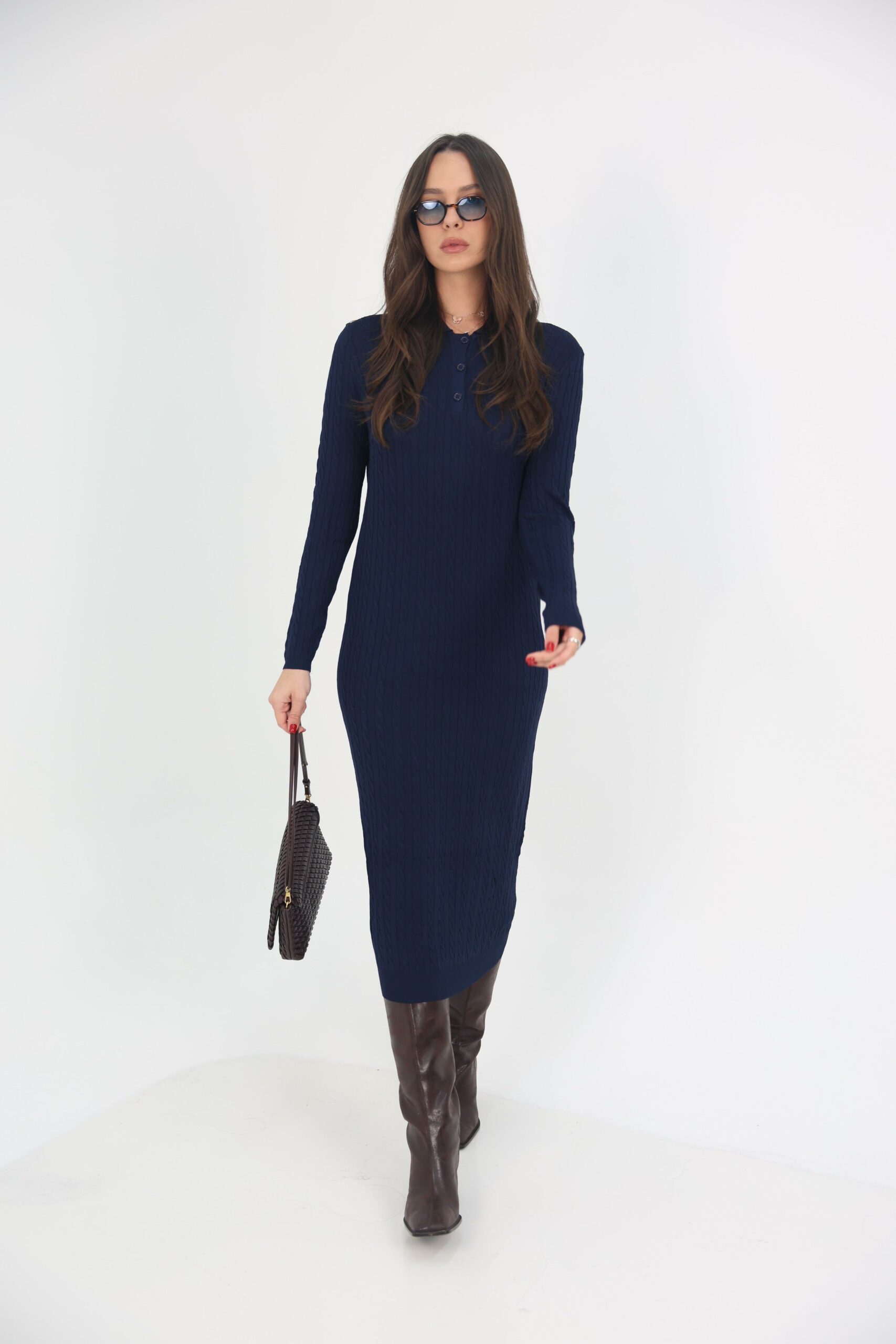 הבד נופל בצורה חלקה על הגוף ויוצר מראה אלגנטי, צנוע ומדויק – מושלם ליומיום, למשרד או לערב חורפי מחמיא.
